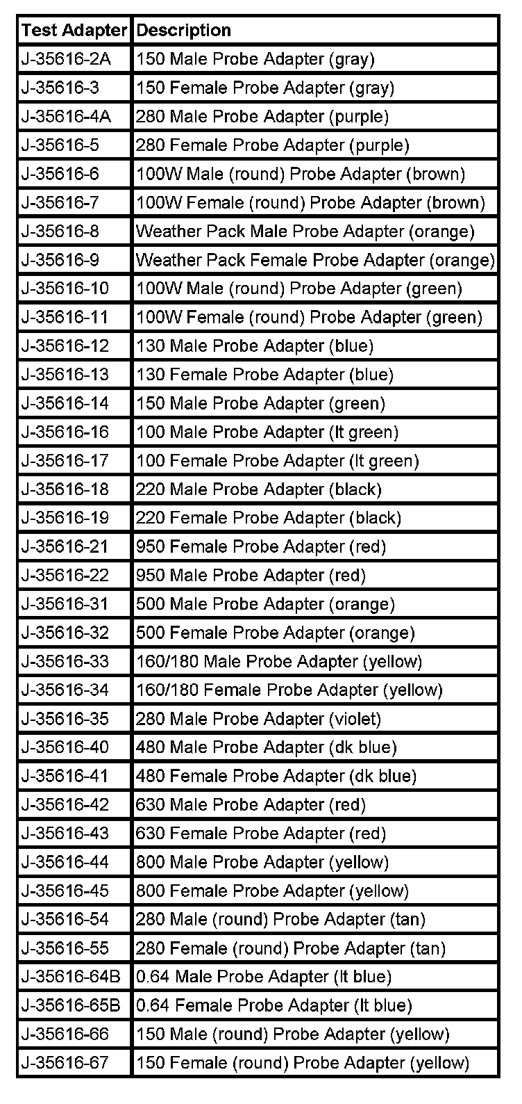 Refer to the table as a guide in selecting the correct test adapter for frontprobing connectors.
