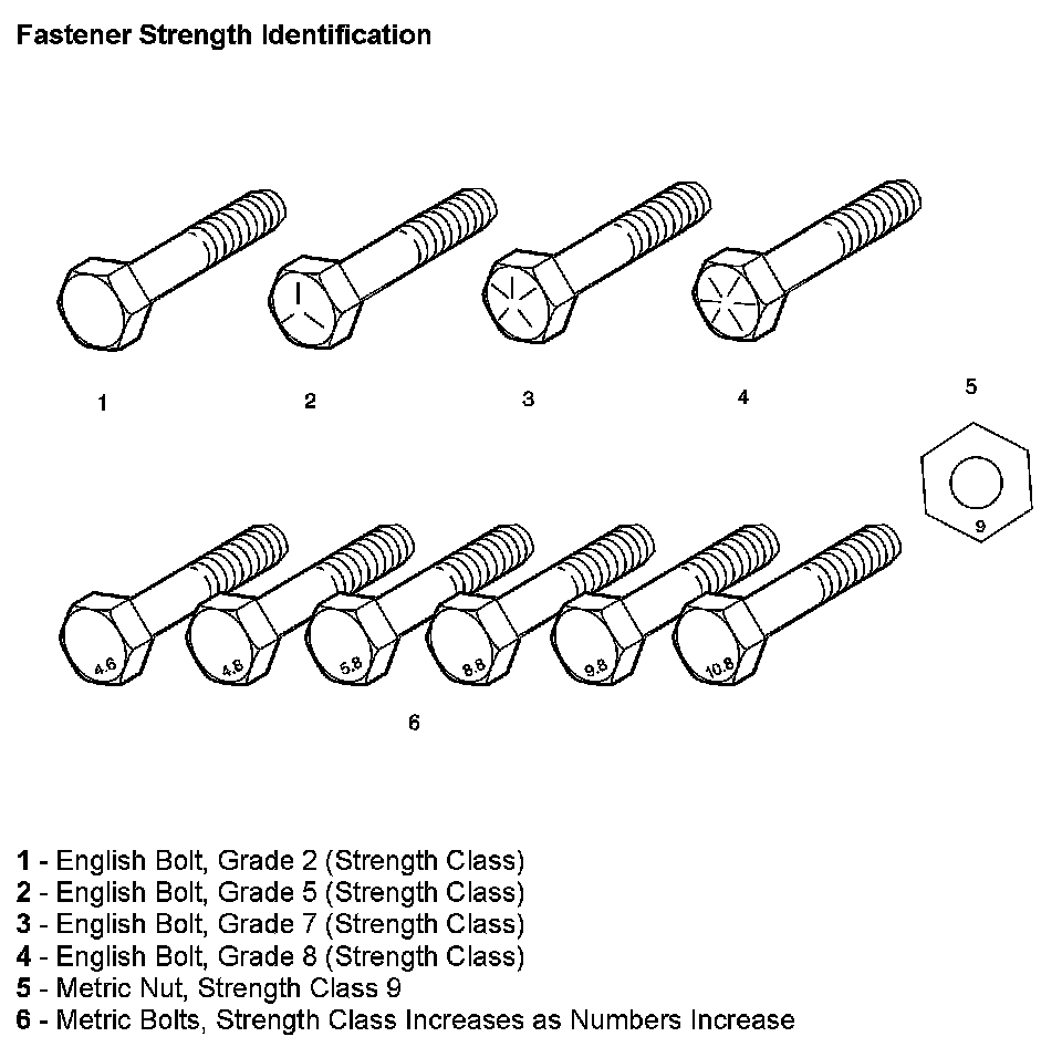 The most commonly used metric fastener strength property classes are 9.8 and 10.9. The class identification is embossed on the head of each bolt. The English, inch strength classes range from grade 2 to grade 8. Radial lines are embossed on the head of each bolt in order to identify the strength class. The number of lines on the head of the bolt is 2 lines less than the actual grade. For example, a grade 8 bolt will have 6 radial lines on the bolt head. Some metric nuts are marked with a single digit strength identification number on the nut face.