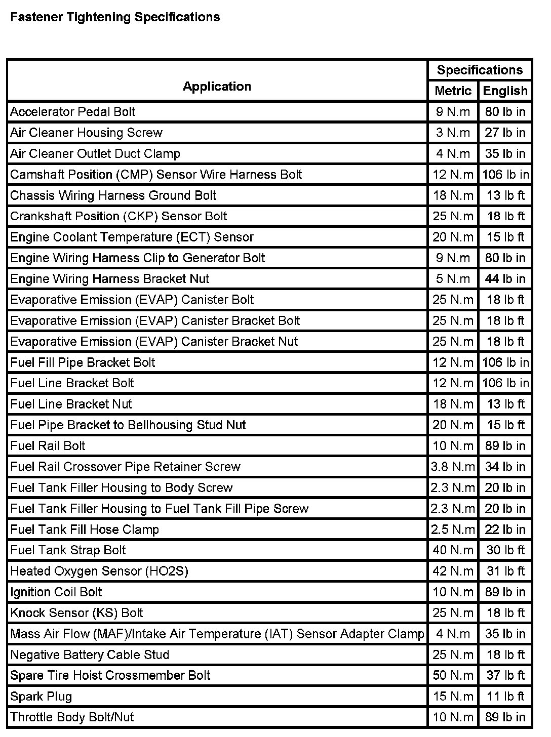 Fastener Tightening Specifications:
