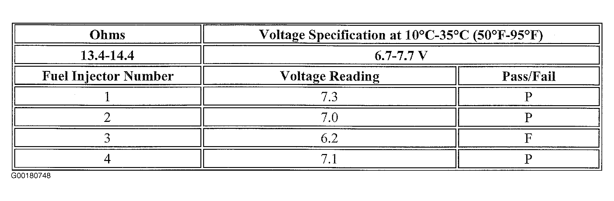 The first second of the voltage displayed by the DMM may be inaccurate due to the initial current surge, therefore, record the lowest voltage displayed by the DMM after the first second of the test. The voltage displayed by the DMM should be within the specified range. See Fig 1 for an example. The voltage displayed by the DMM may increase throughout the test as the fuel injector windings warm and the resistance of the fuel injector windings changes. An erratic voltage reading, or large fluctuations in voltage that do not stabilize, indicates an intermittent connection within the fuel injector.