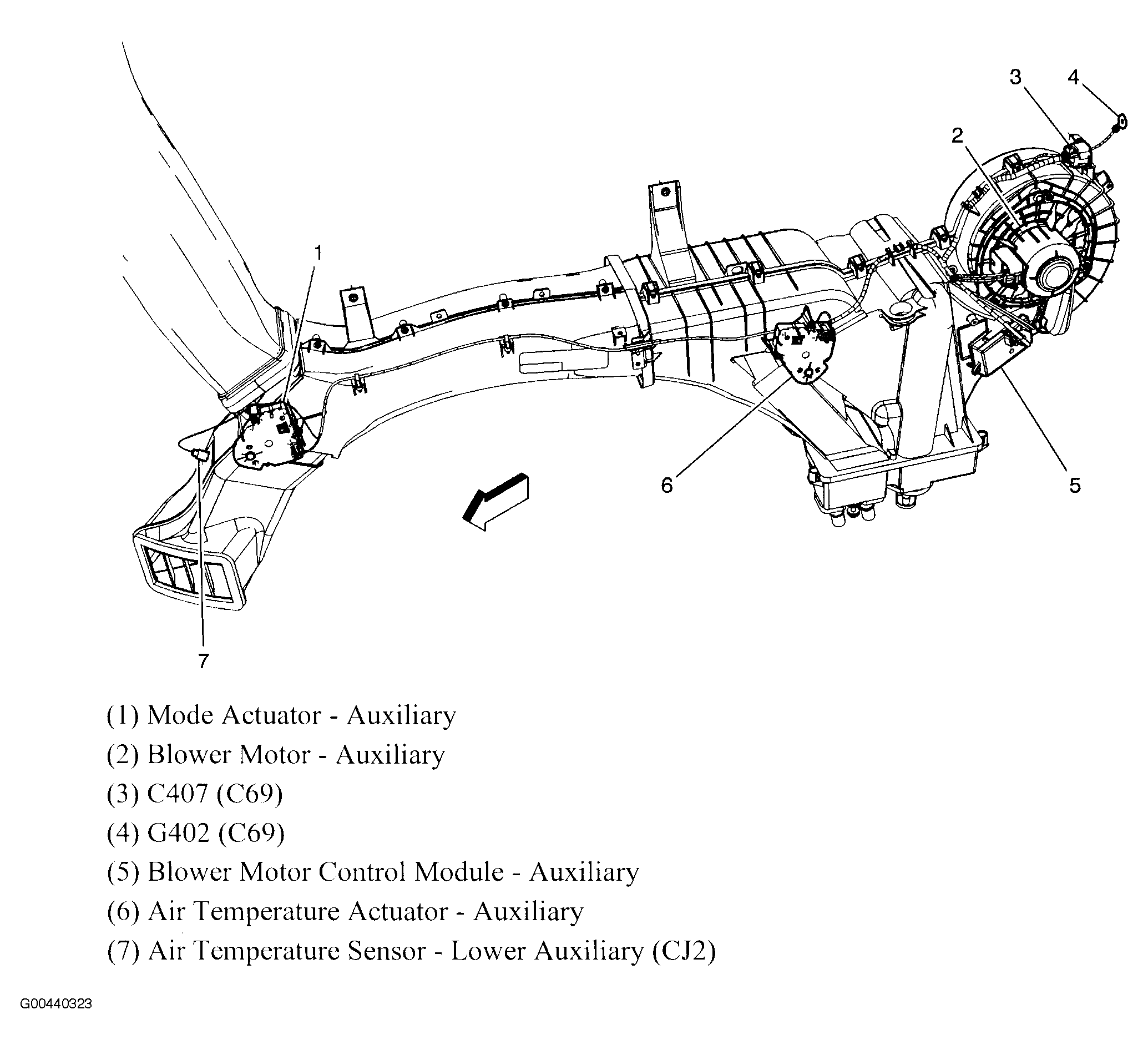 | Blower Motor Control Module - Auxiliary (Short Wheel Base) | Below rear HVAC blower motor. See Figure. |