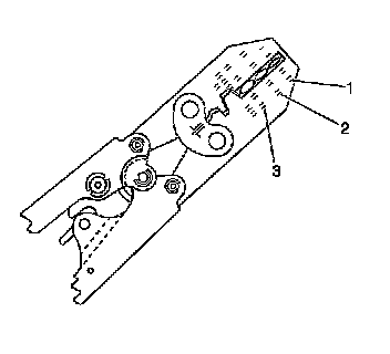 5. Use the Splice Crimp Tool from the J-38125 in order to position the DuraSeal splice sleeve in the proper color nest of the Splice Crimp Tool. The crimp tool has three nests, 1 is for the salmon and green splice sleeve, 2 is for the blue splice sleeve, and 3 is for the yellow splice sleeve.