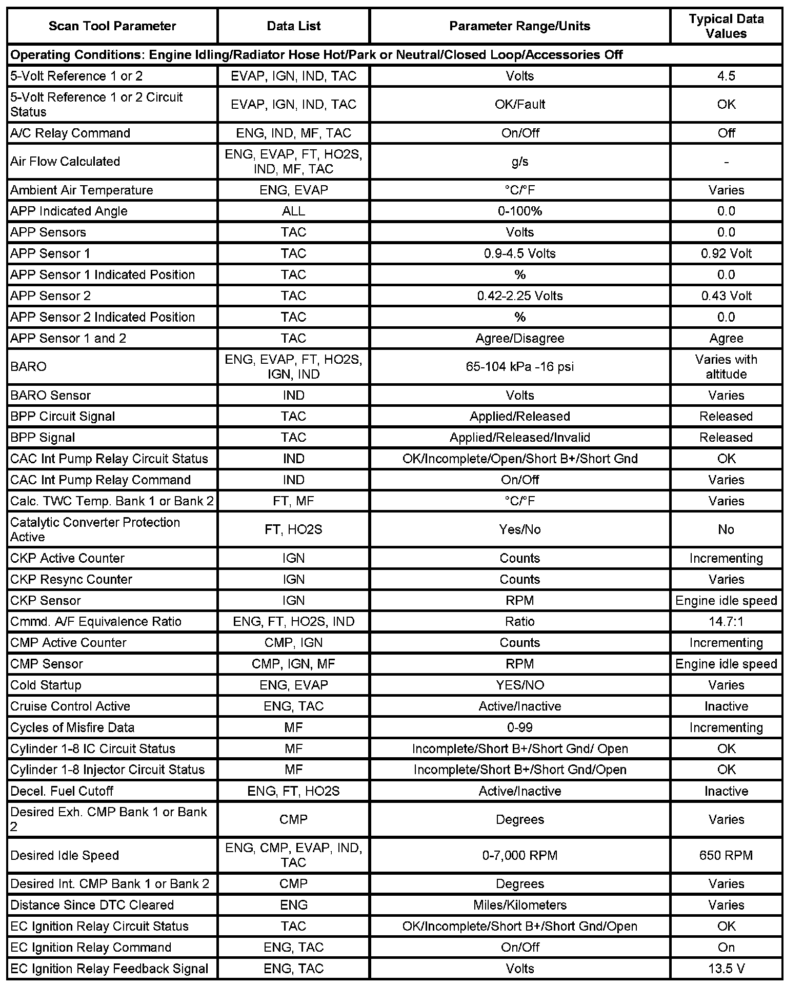 The Engine Scan Tool Data List contains all engine related parameters that are available on the scan tool. The list is arranged in alphabetical order. A parameter may appear in any one of the data lists, and in some cases may appear more than once, or in more than one data list in order to group certain related parameters together.
