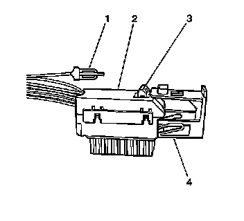 3. Remove the connector position assurance (CPA) (1) from the wiring harness connector (2) to the inflatable restraint sensing and diagnostic module (SDM).