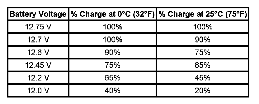 Important: Using voltage to determine the batteries state of charge (SOC) is only accurate after the battery has been at rest for 24 hours. This is enough time for the acid in each cell to equalize. If the battery has been charged or discharged in the past 24 hours, the battery SOC will only be an estimate.