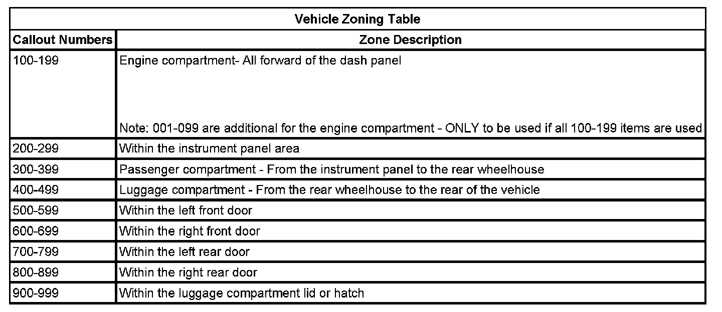 All grounds, in-line connectors, pass-through grommets, and splices have identifying numbers that correspond to where they are located in the vehicle. The table explains the numbering system.