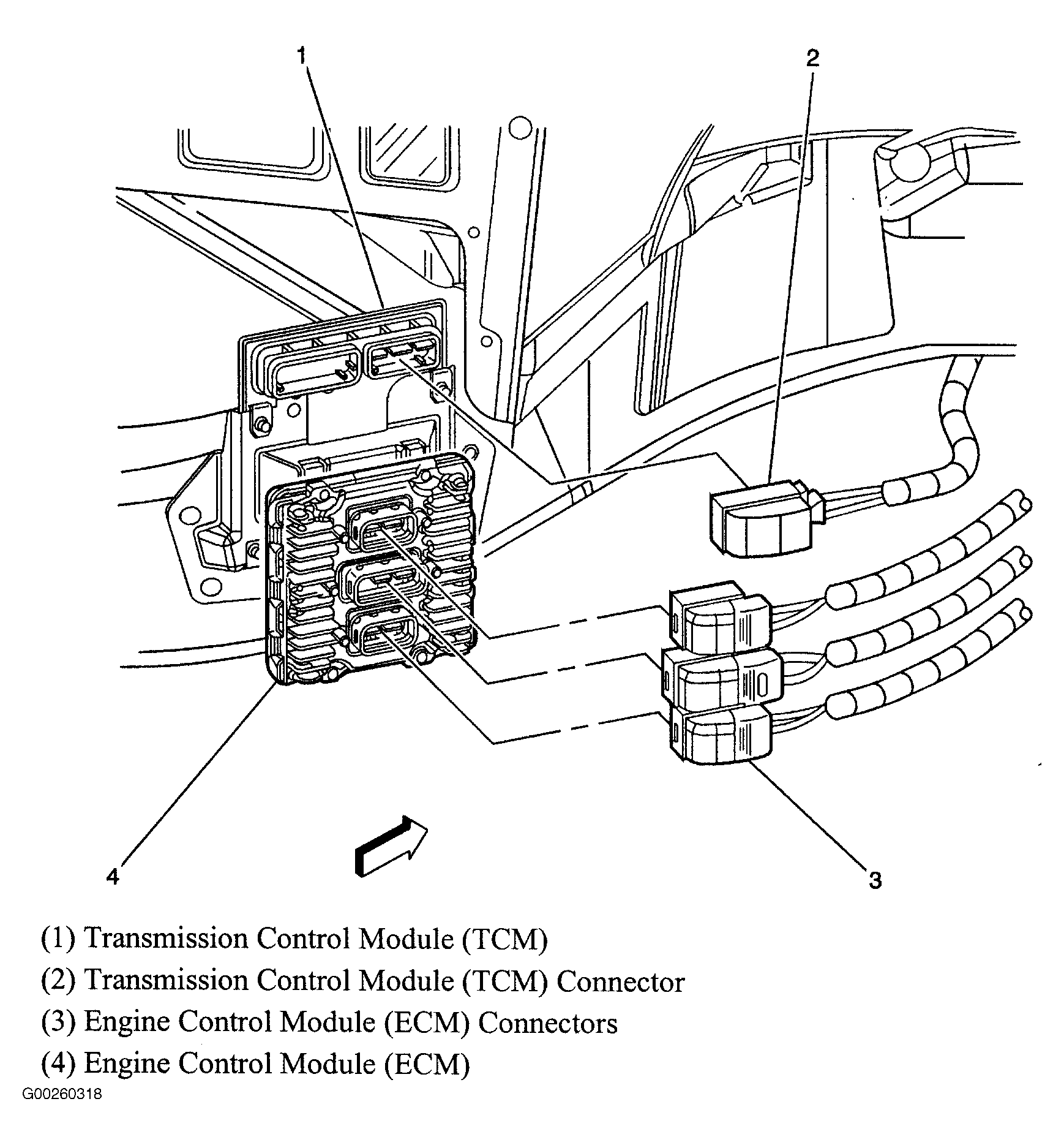 | Transmission Control Module (TCM) | Lower right rear of engine compartment. See Figure. |