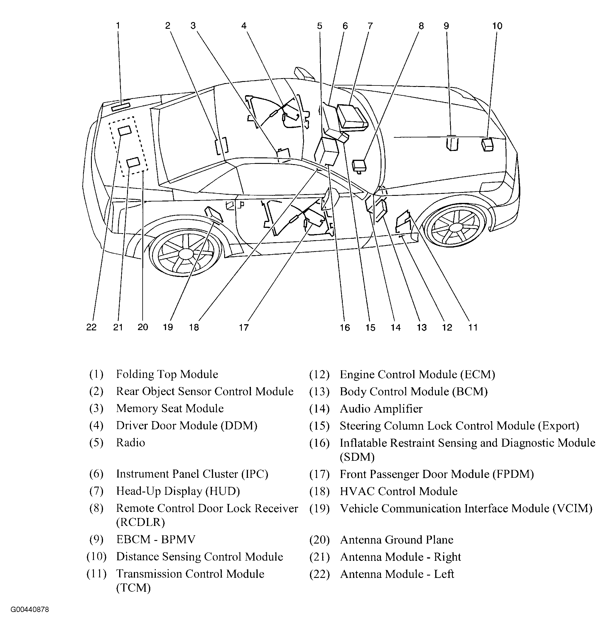 | Folding Top Module | Left side of folding top storage compartment. See Figure. |