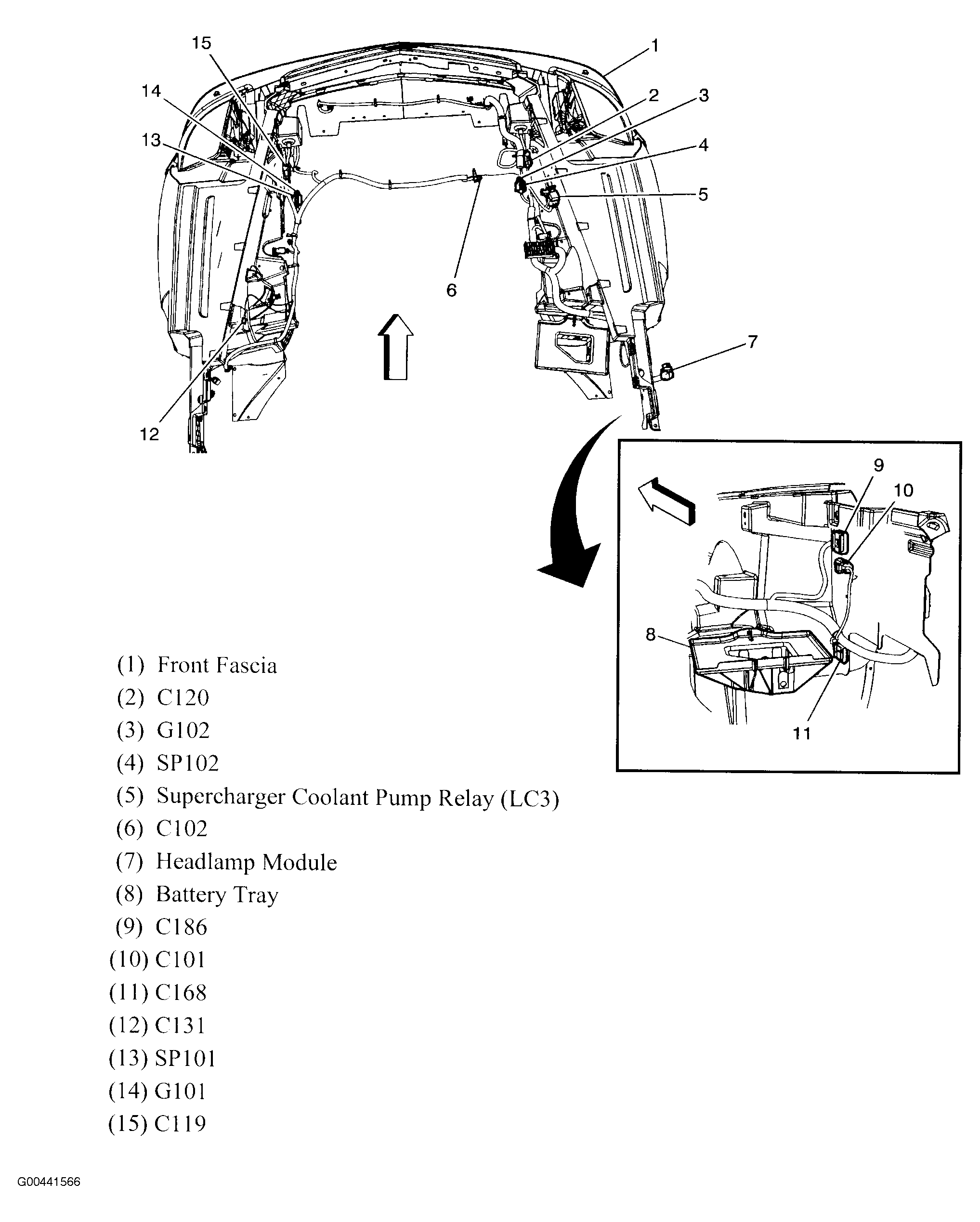 | Headlamp Module | Right rear corner of engine compartment. See Figure. |