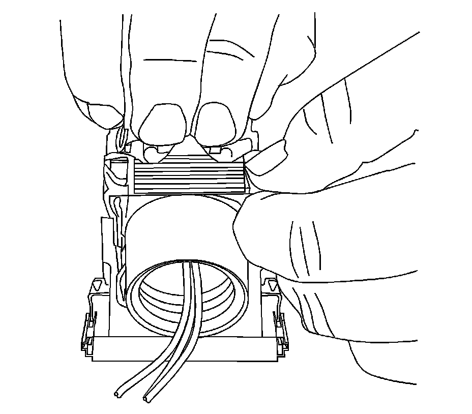 8. Remove the nose piece by inserting a small flat-blade tool into the slots on both ends of the connector body. Gently pry the nose piece out of the connector. J 38125-216 can also be used to remove the nose piece.
