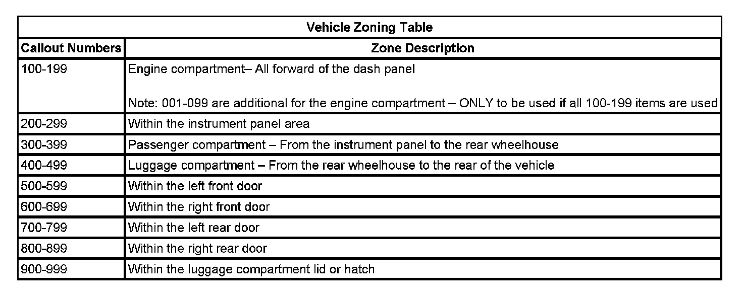 All grounds, in-line connectors, pass-through grommets, and splices have identifying numbers that correspond to where they are located in the vehicle. The table explains the numbering system.