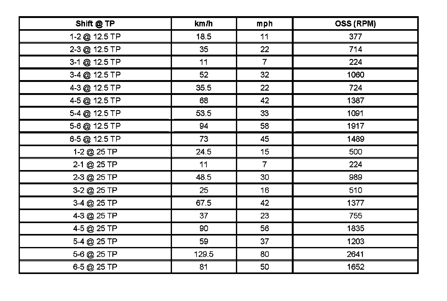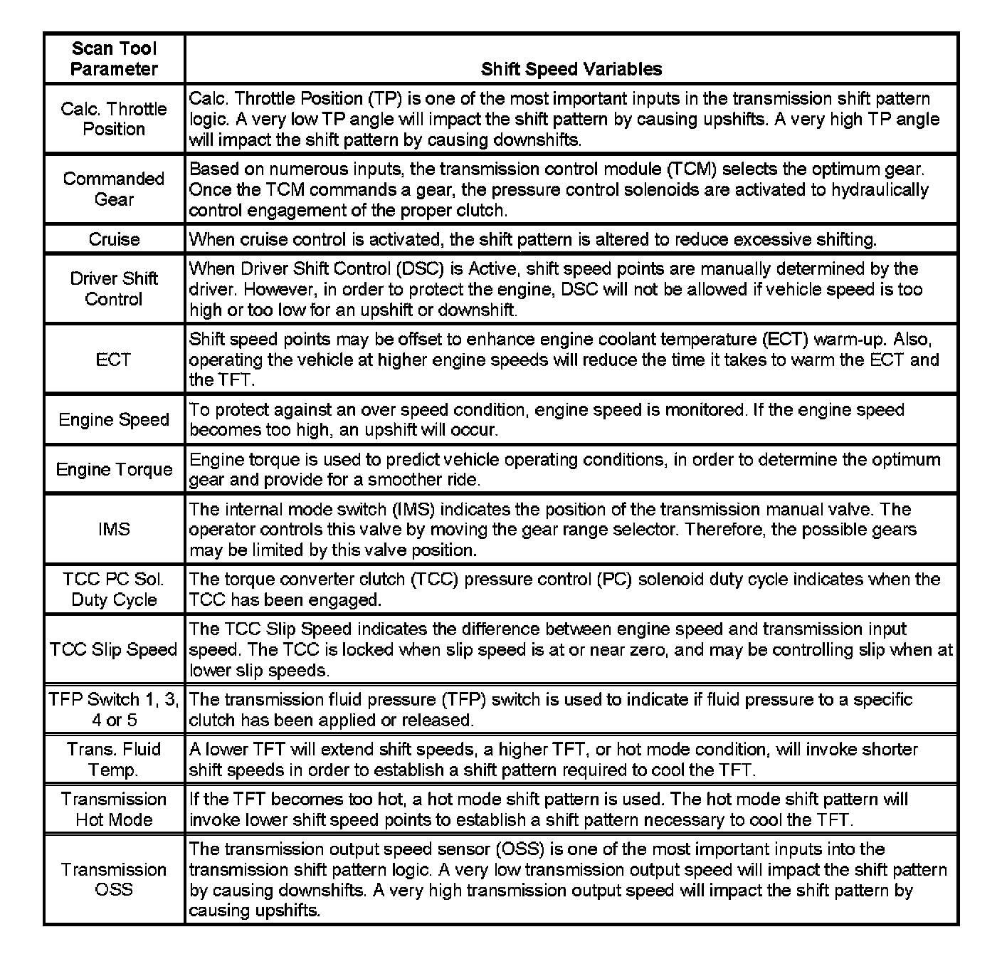 Important: Shift speed points are affected by many different vehicle and transmission operating conditions. The table above represents shift speed points calibrated at specific throttle angles during normal operating conditions and a temperature range between 0 -130°C (32-266°F). These shift speed points are also based on an axle ratio of 2.56, and assume a production-intent tire size. The table below illustrates a number of different variables that influence these shift speed points. Based on a given operating condition, these variables may override the normal shift speed points. To assist in monitoring the different variables, the respective scan tool data parameter is also listed.
