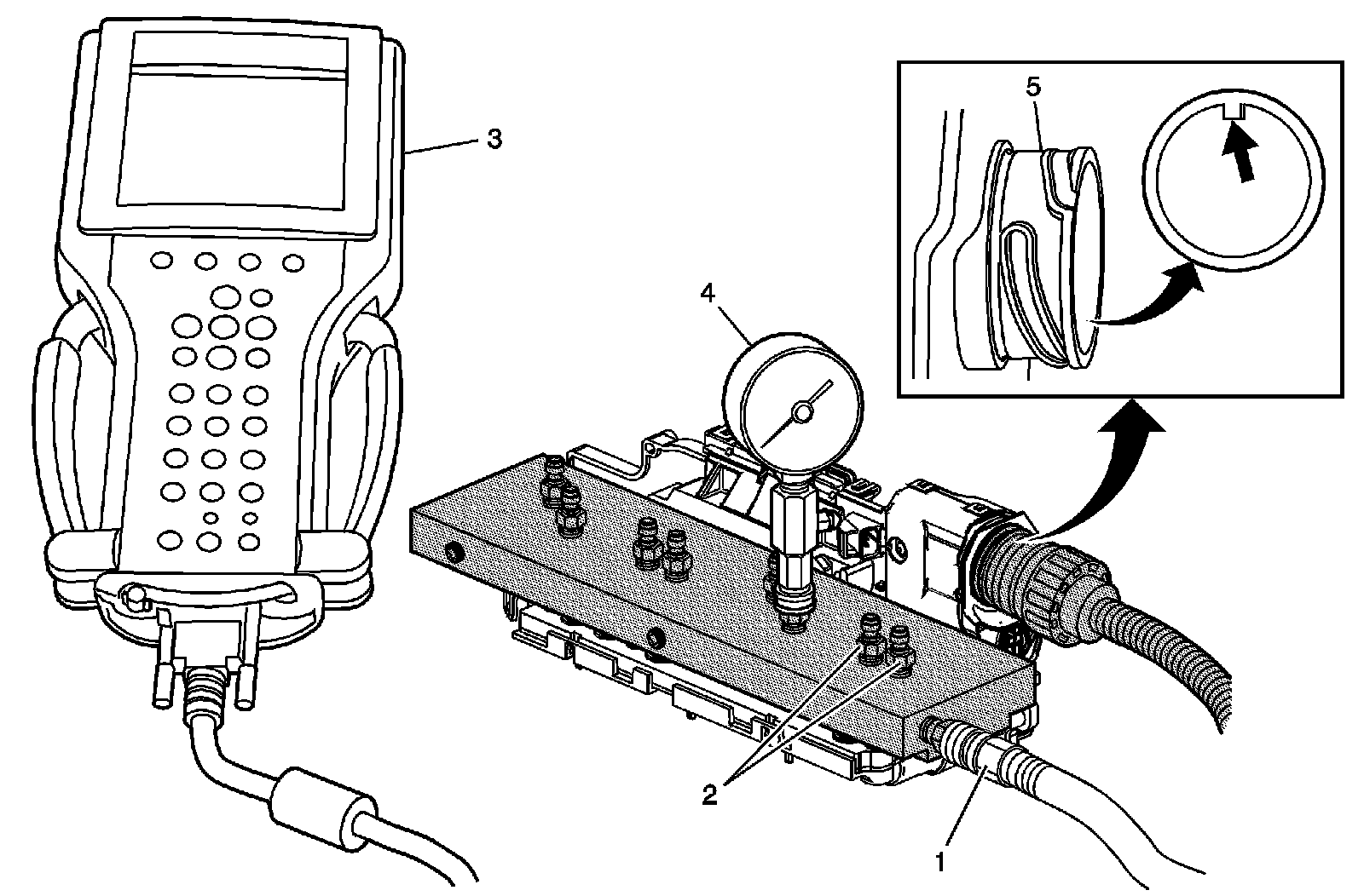 An air pressure gage is used to display the air passing through the solenoid. If the solenoid is unable to allow air through or the air is constantly flowing through the solenoid may be stuck. The scan tool is used to command the solenoids On and Off while watching the air pressure test gage to determine if the solenoid is functioning correctly. The recommended shop air pressure for this test is 620.5-689.4 Kpa (90-100 psi).