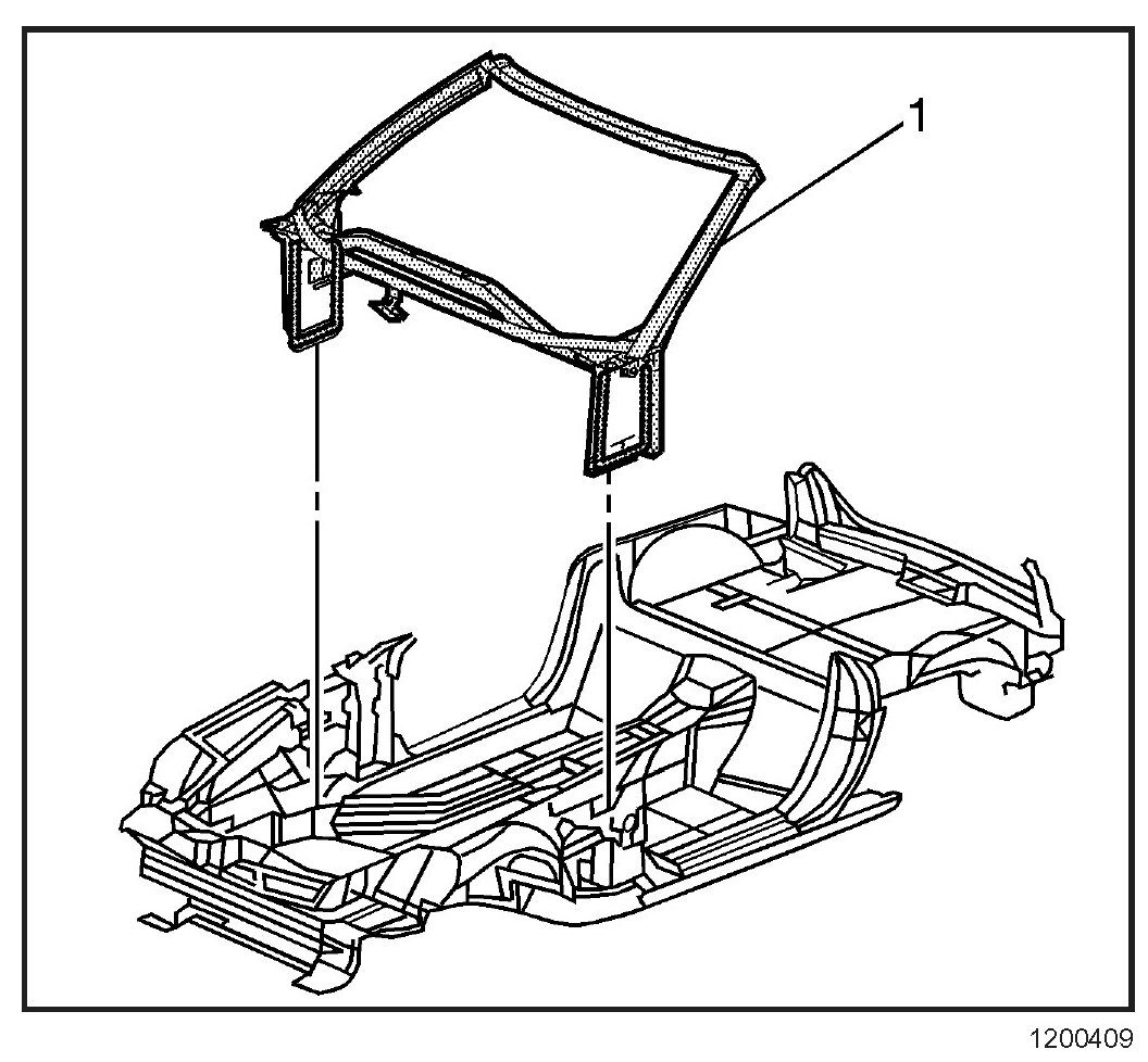3. Apply a consistent bead of structural adhesive (1) 10 mm (3/8 in) in diameter to the windshield frame to mate with the bonding surfaces. Refer to Sheet Molded Compound (SMC) Panel Bonding.