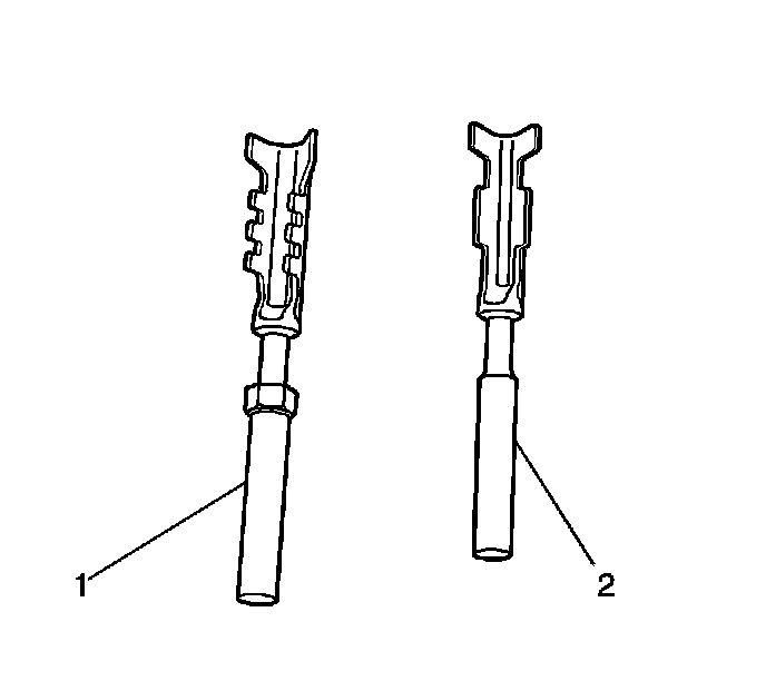 Important: There are 2 styles of Micro-Pack 100W terminals which are very similar. Ensure that you have the correct terminal before crimping the new terminal to the wire. The first design connector uses the longer terminal (1) that has a raised area in front of the recess in the terminal. The second design connector uses the shorter terminal without the raised area.