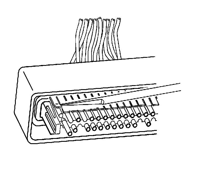 9. Use J 38125-12A (GM P/N 12094429) to gently lift the terminal retaining tab while gently pulling the wire out of the back of the connector. Always remember never use force when pulling a terminal out of a connector. See the release tool cross reference in the Reference Guide of the J-38125 to ensure that the correct release tool is used.