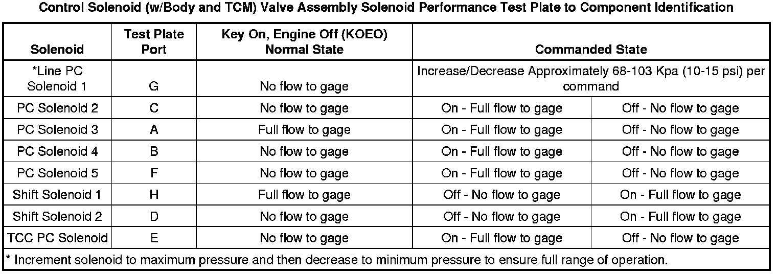 6. With the ignition ON and the scan tool communicating with the vehicle, command the solenoid in question On and Off. Watch the air pressure gage for a change as you command the solenoid. Refer to Control Solenoid (w/Body and TCM) Valve Assembly Solenoid Performance Test Plate to Component Identification for correct solenoid function and test plate port connections for the solenoid being tested.