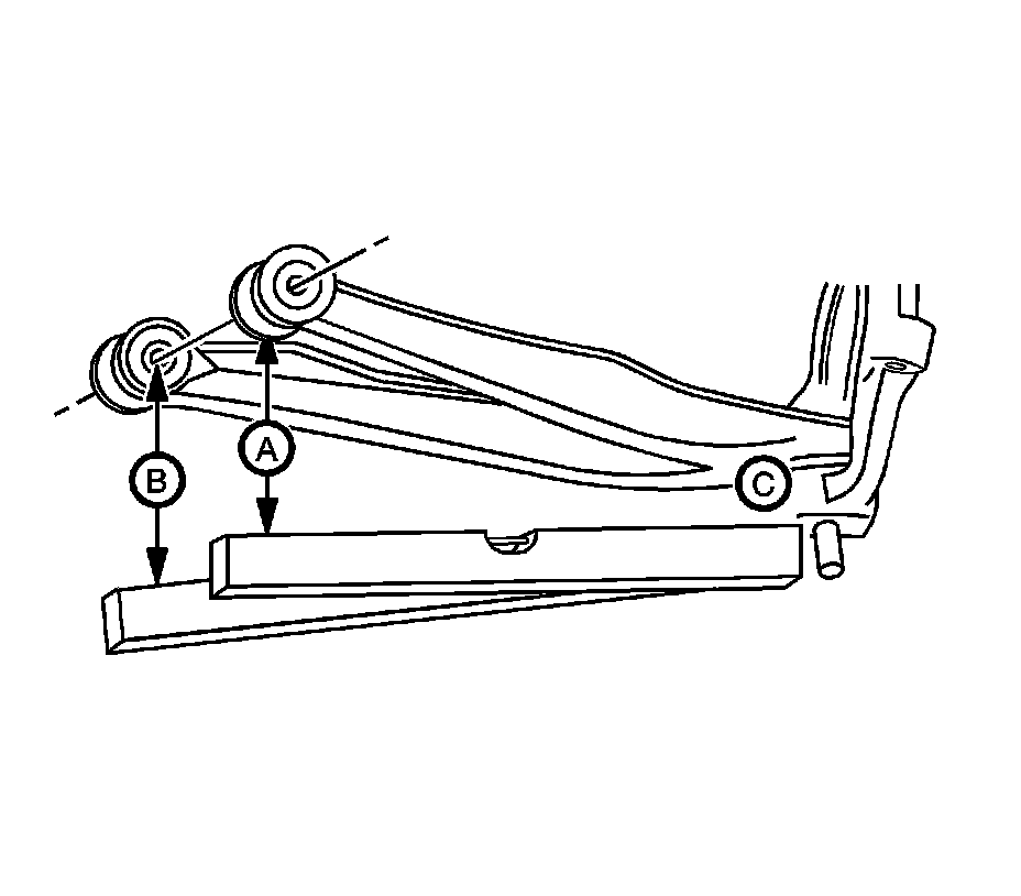 2. Set the top edge of the level on the reference surface of the steering knuckle (C) and extend the level directly under the rear end of the front attachment bolt of the lower control arm (A).