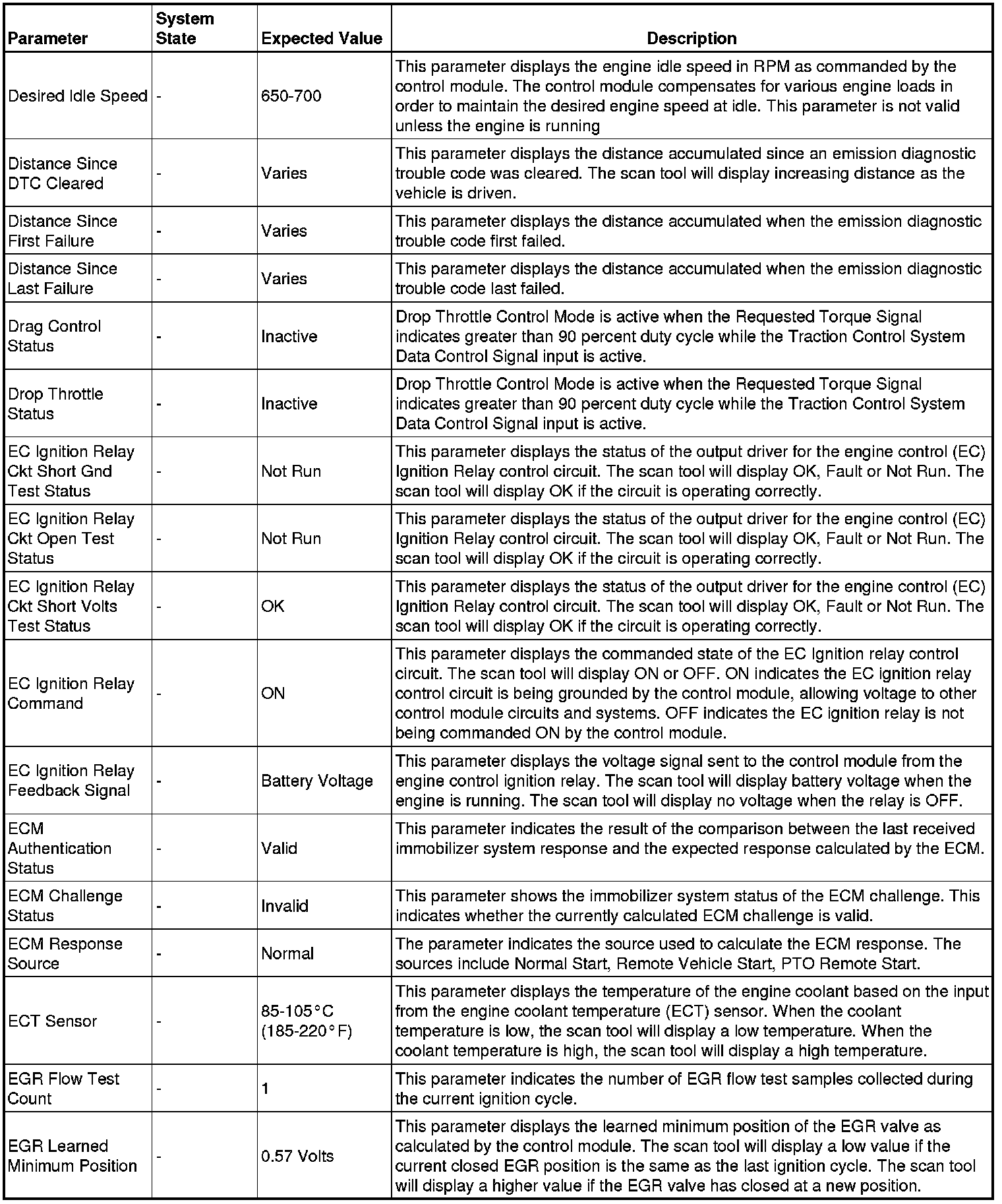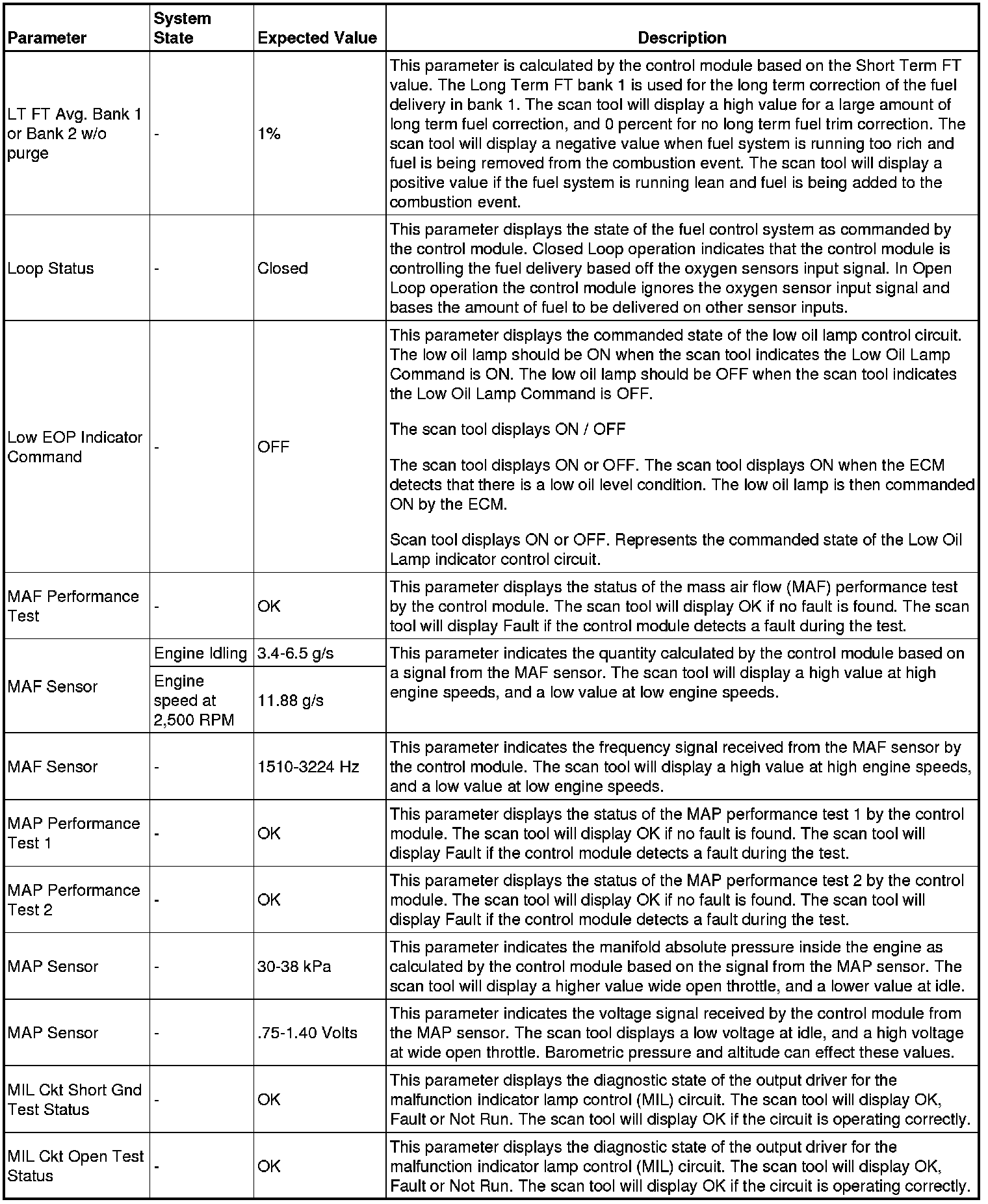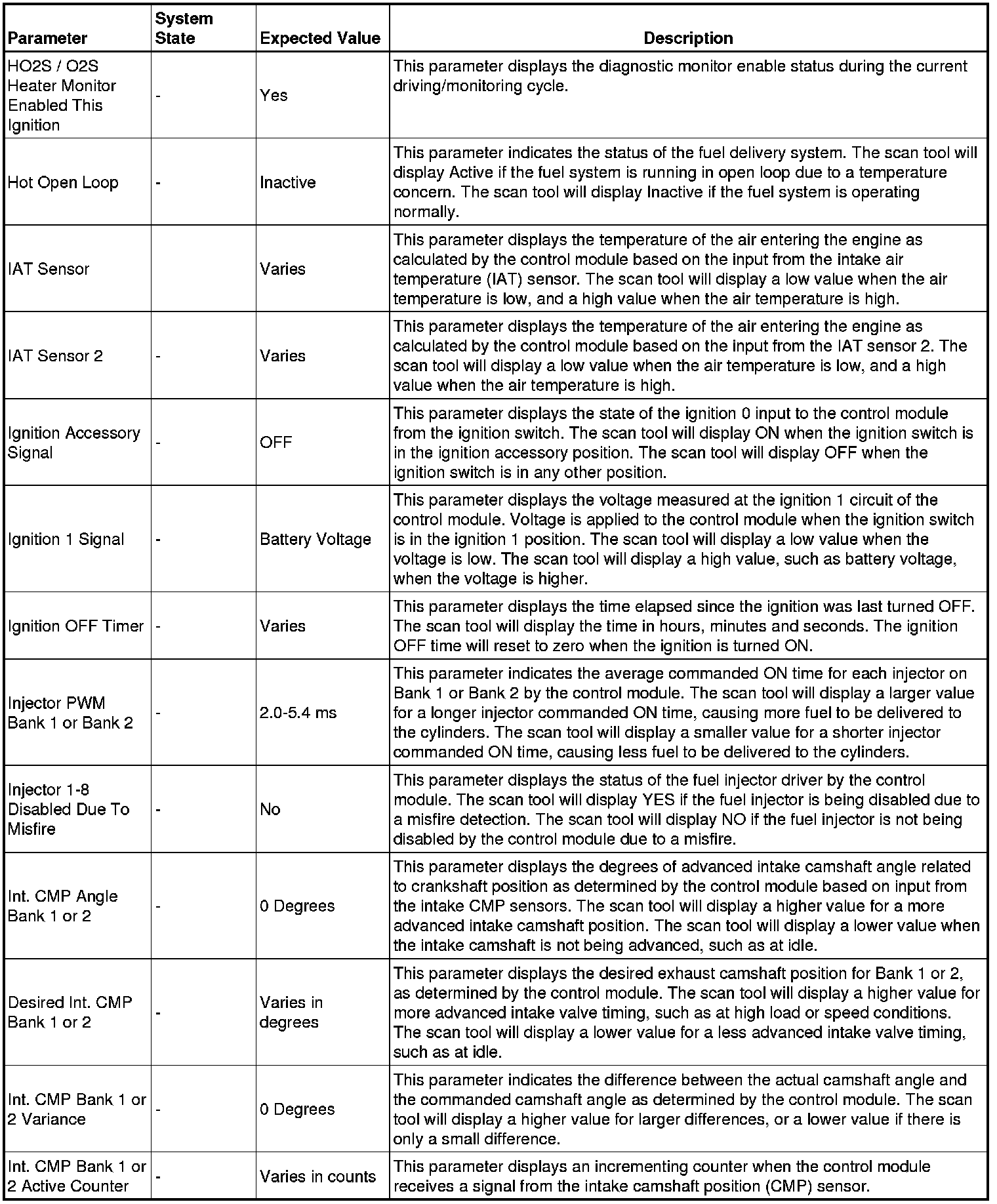The scan tool values from a properly running engine may be used for comparison with the engine you are diagnosing. The engine scan tool data list represents values that would be seen on a normally running engine.