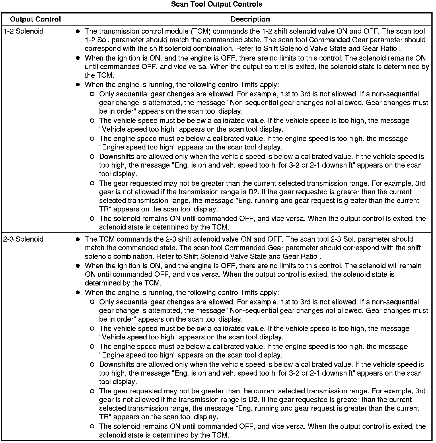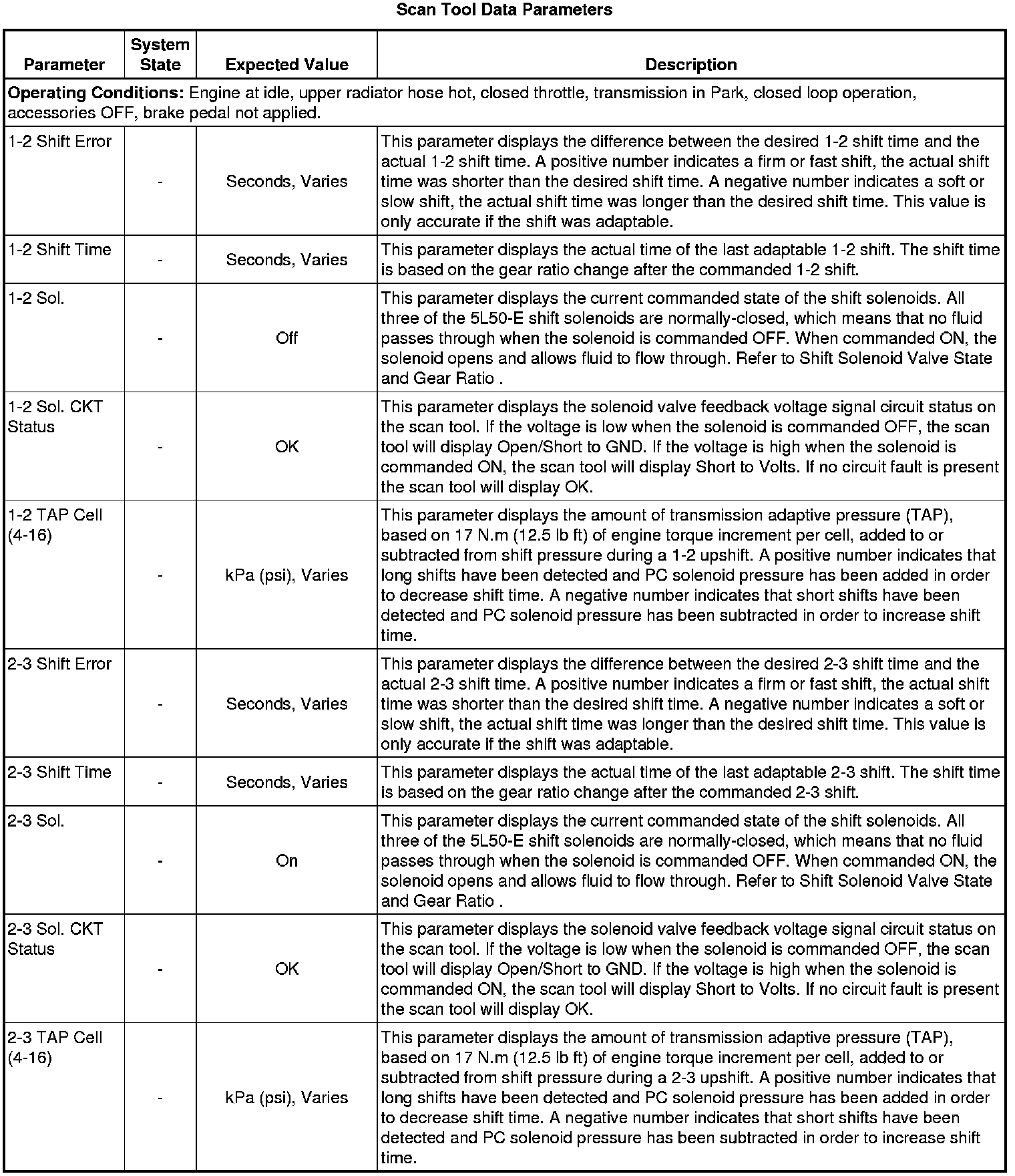 The Transmission Control Module Scan Tool Data List contains all transmission related parameters that are available on the scan tool. The list is arranged in alphabetical order. A given parameter may appear in any one of the data lists, and in some cases may appear more than once, or in more than one data list in order to group certain related parameters together.
