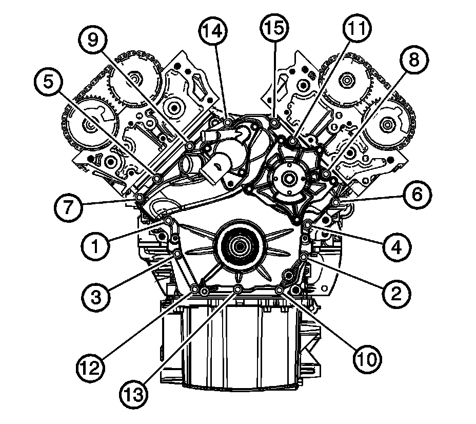 Tighten the engine front cover bolts in the sequence shown.