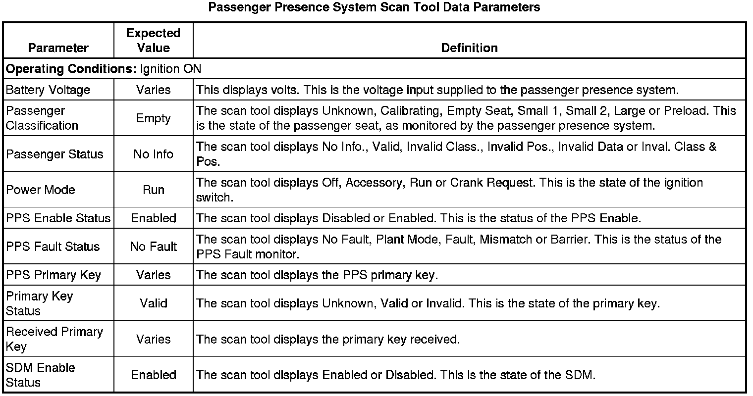 Inflatable Restraint Passenger Presence System Scan Tool Information