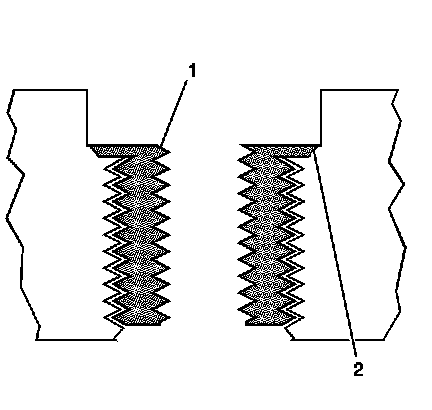 15. Inspect the insert for proper installation into the tapped hole. A properly installed insert (1) will be either flush or slightly below flush with the surface of the base material (2).