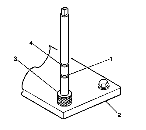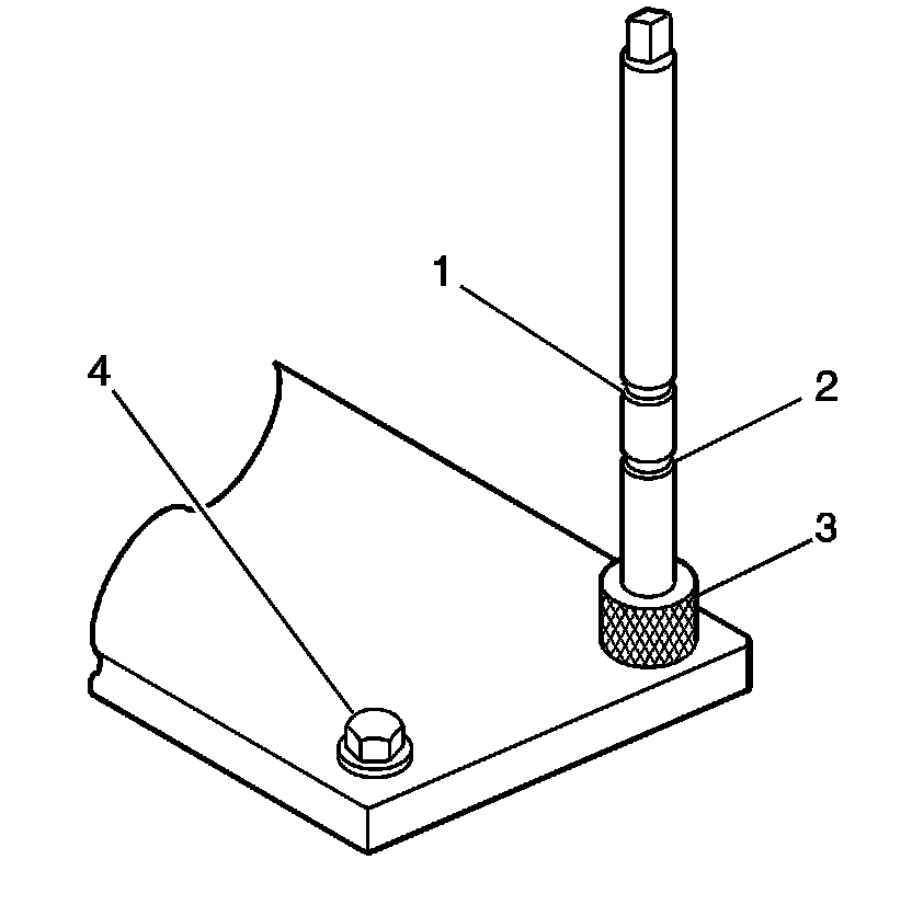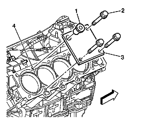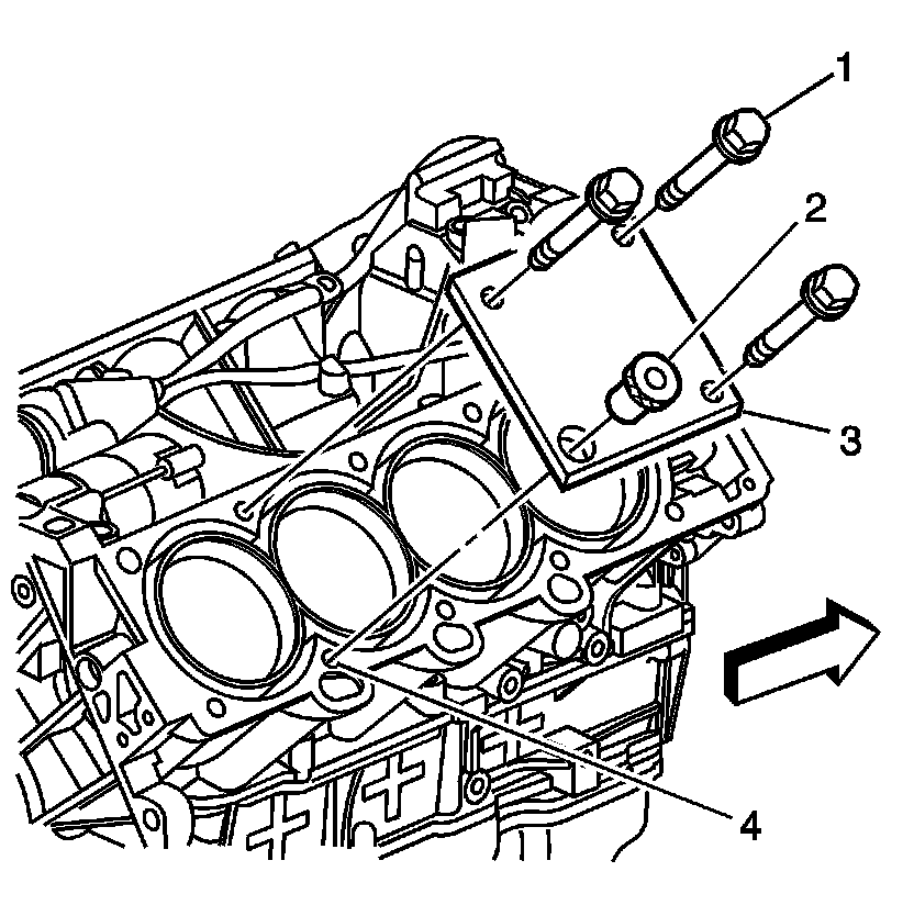 1. Position the fixture plate (3) with the bushing (1) installed over the cylinder head bolt hole to be repaired (4).