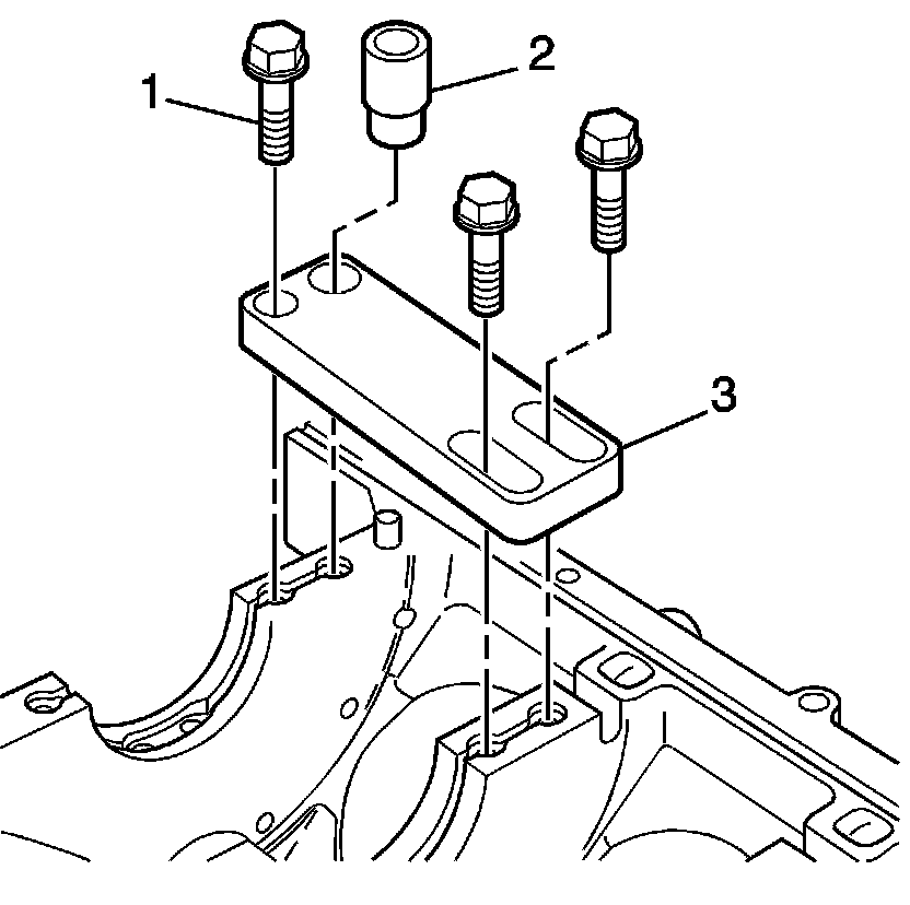 1. Position the fixture plate (3) with the bushing (2), installed over the crankshaft main cap bolt hole to be repaired.