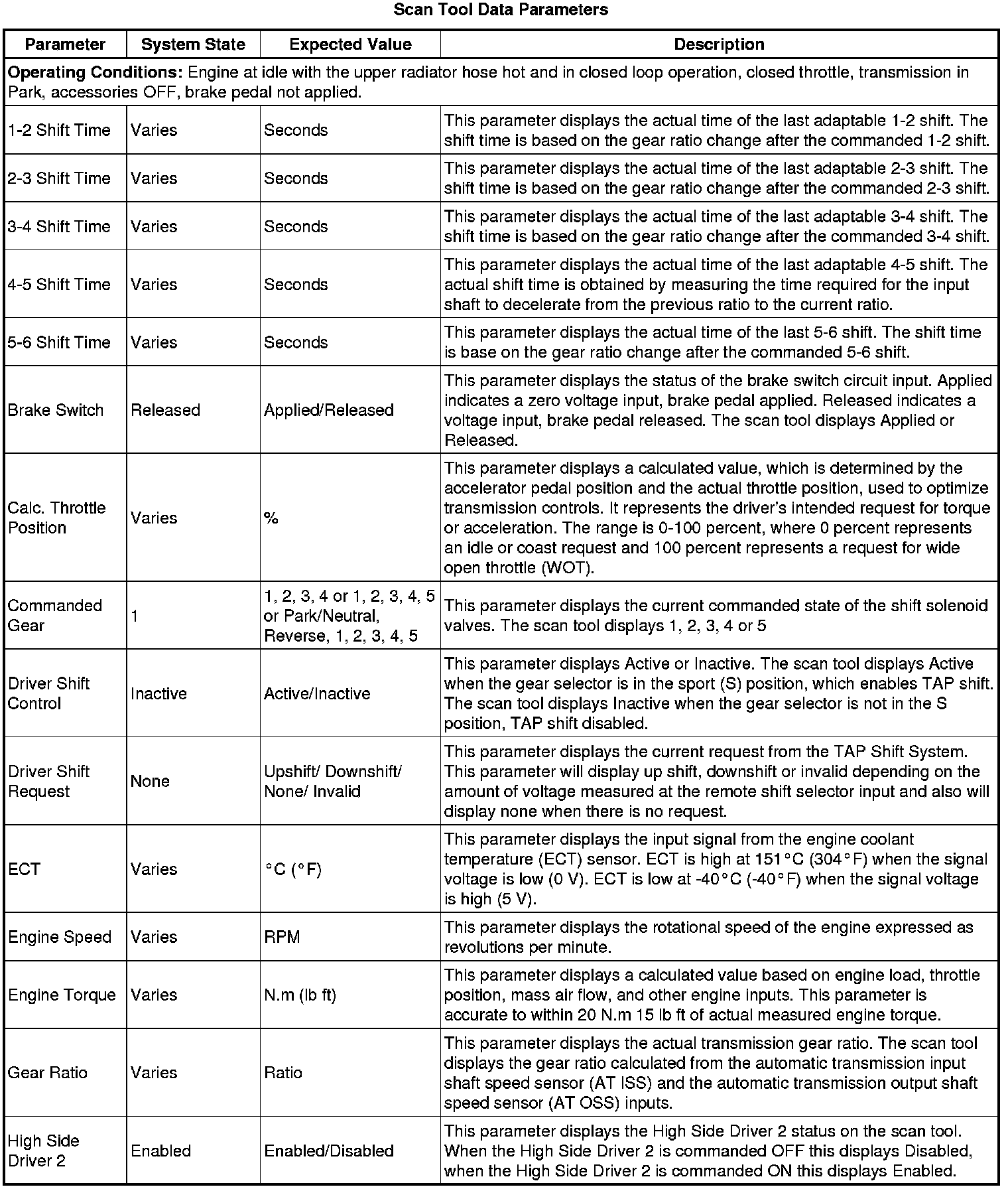 The Transmission Control Module Scan Tool Data List contains all transmission related parameters that are available on the scan tool. The list is arranged in alphabetical order. A given parameter may appear in any one of the data lists, and in some cases may appear more than once, or in more than one data list in order to group certain related parameters together.
