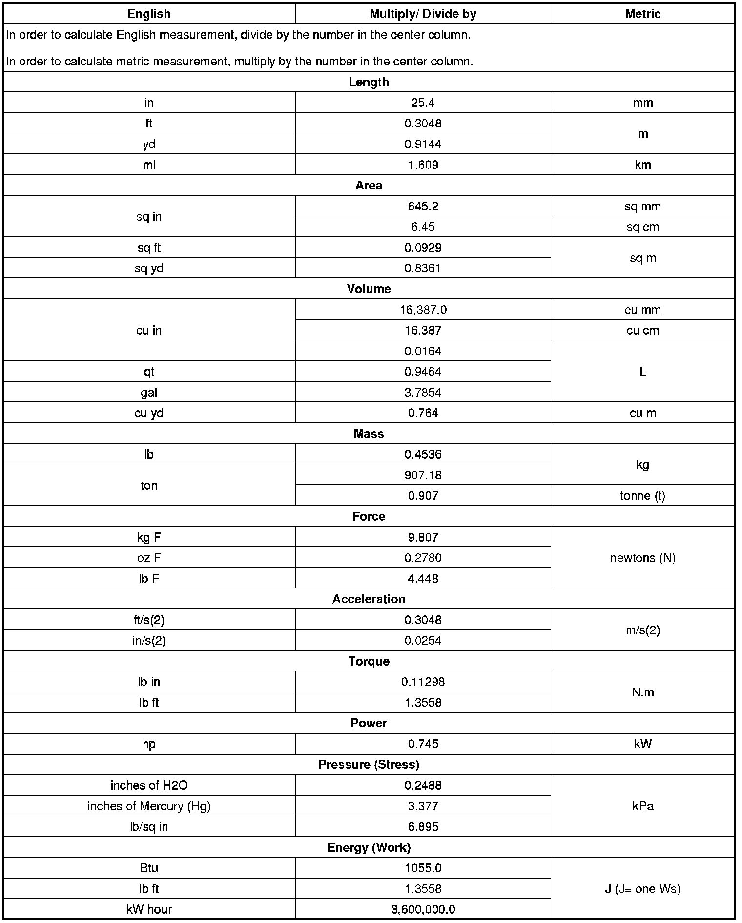 US English/Metric Conversion