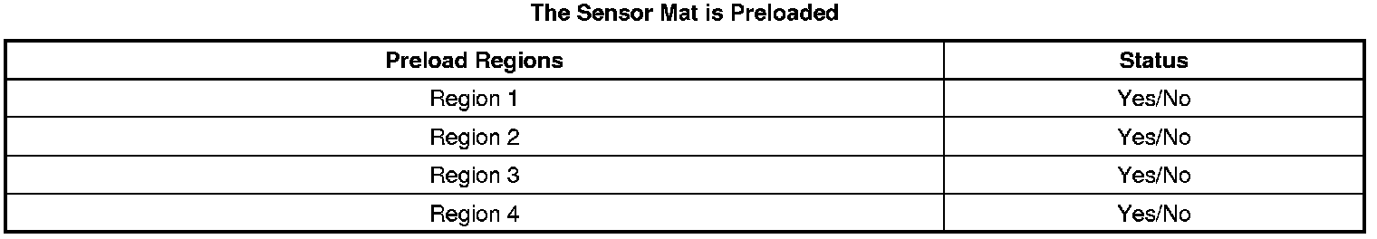 The PPS will fail the preload test when a region has detected a preload/pressure on it. If a preload test fails, the scan tool will display a chart as illustrated below. A Yes status indicates which region(s) have a preload condition. Refer to the chart below and the above illustration to identify the failed region.