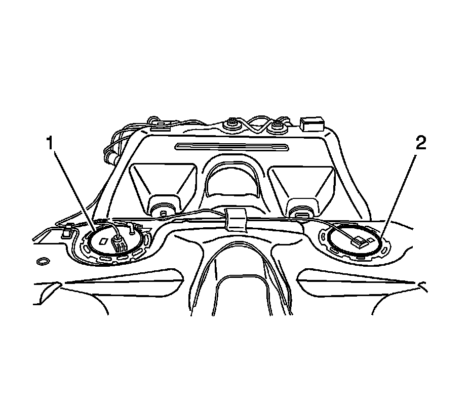 1. Remove the fuel tank in order to gain access to the secondary fuel tank module (2). Refer to Fuel Tank Replacement (Service and Repair).