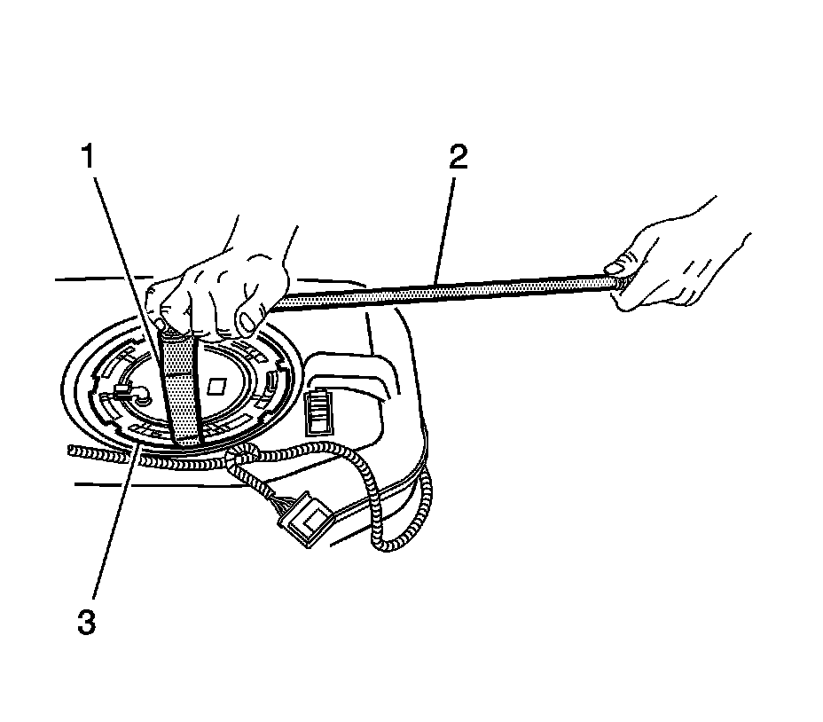 9. Use the J 45722 - wrench (1) and a long breaker-bar (2) to install the fuel tank module lock ring (3), by turning clockwise, until fully seated.