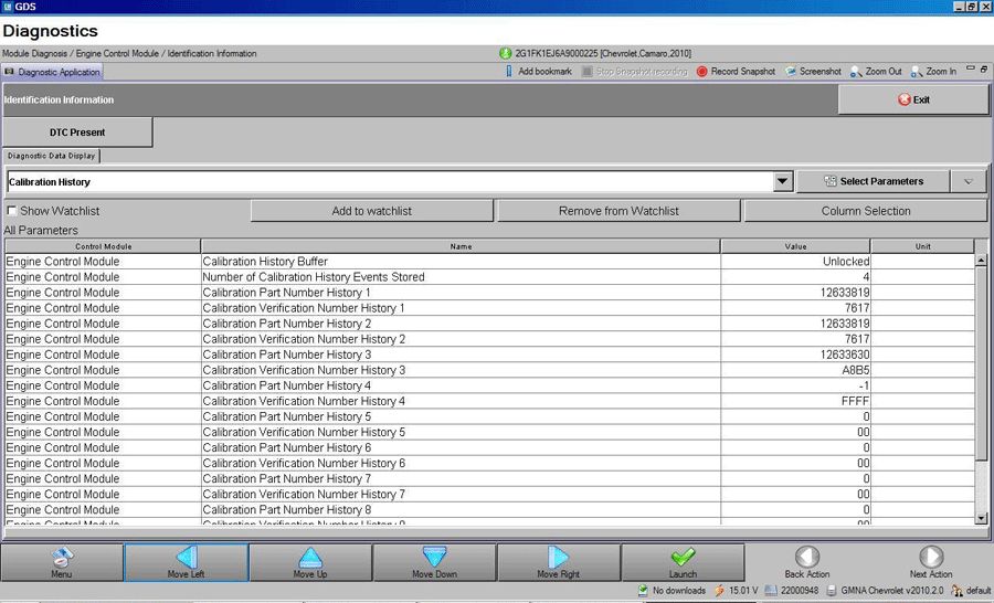8. Take a CLEAR digital picture of the Tech 2(R) Vehicle Information screen showing the engine Calibration IDs and Verification Numbers as shown above. Retain the printout information and the Tech 2(R) screen photograph with the repair order.