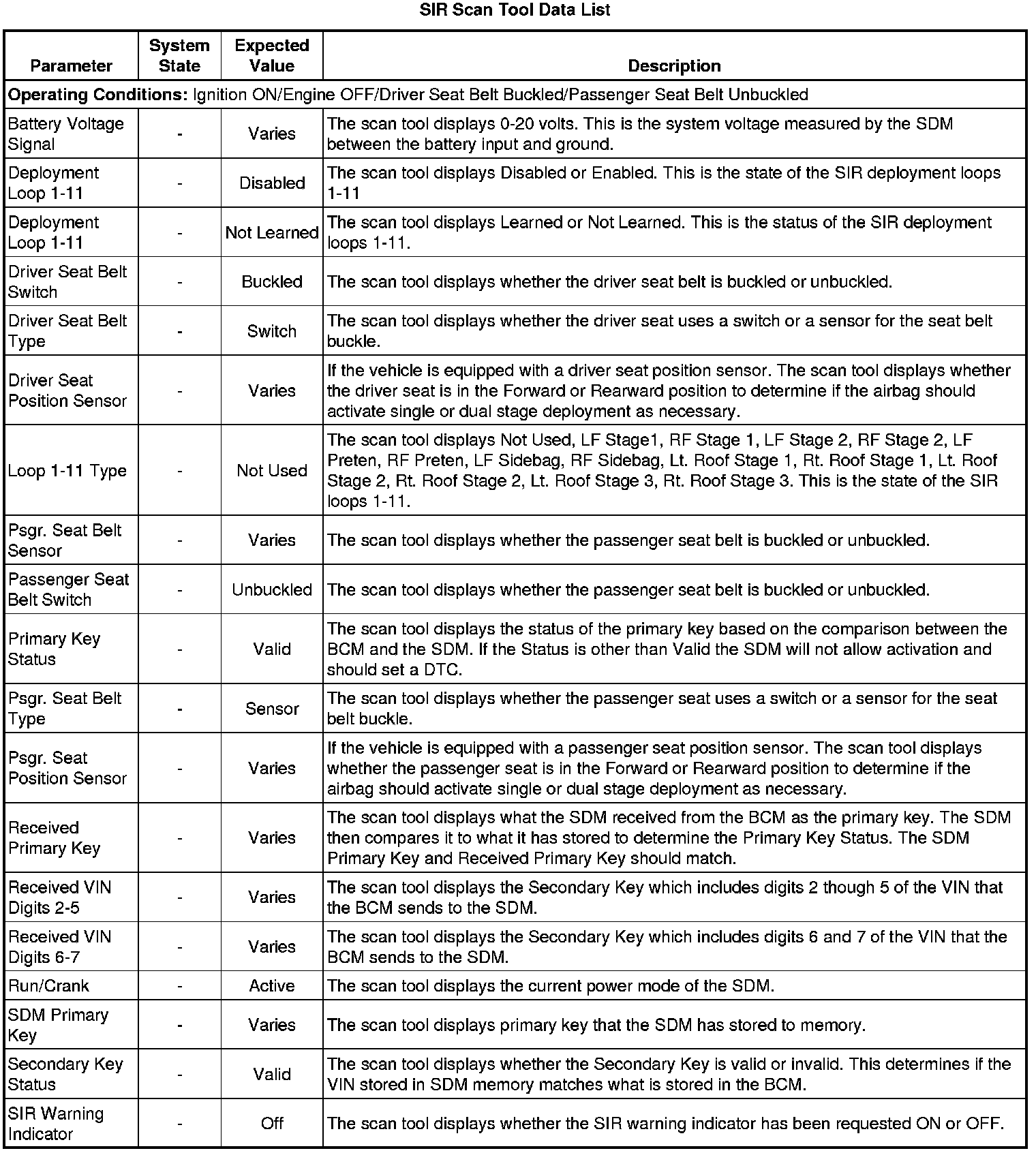 Use the SIR scan tool data list as directed by a diagnostic table or in order to supplement the diagnostic procedures. Begin all of the diagnostic procedures with the Diagnostic System Check - Vehicle (Initial Inspection and Diagnostic Overview). Use the Scan Tool Data Lists after the following is determined: