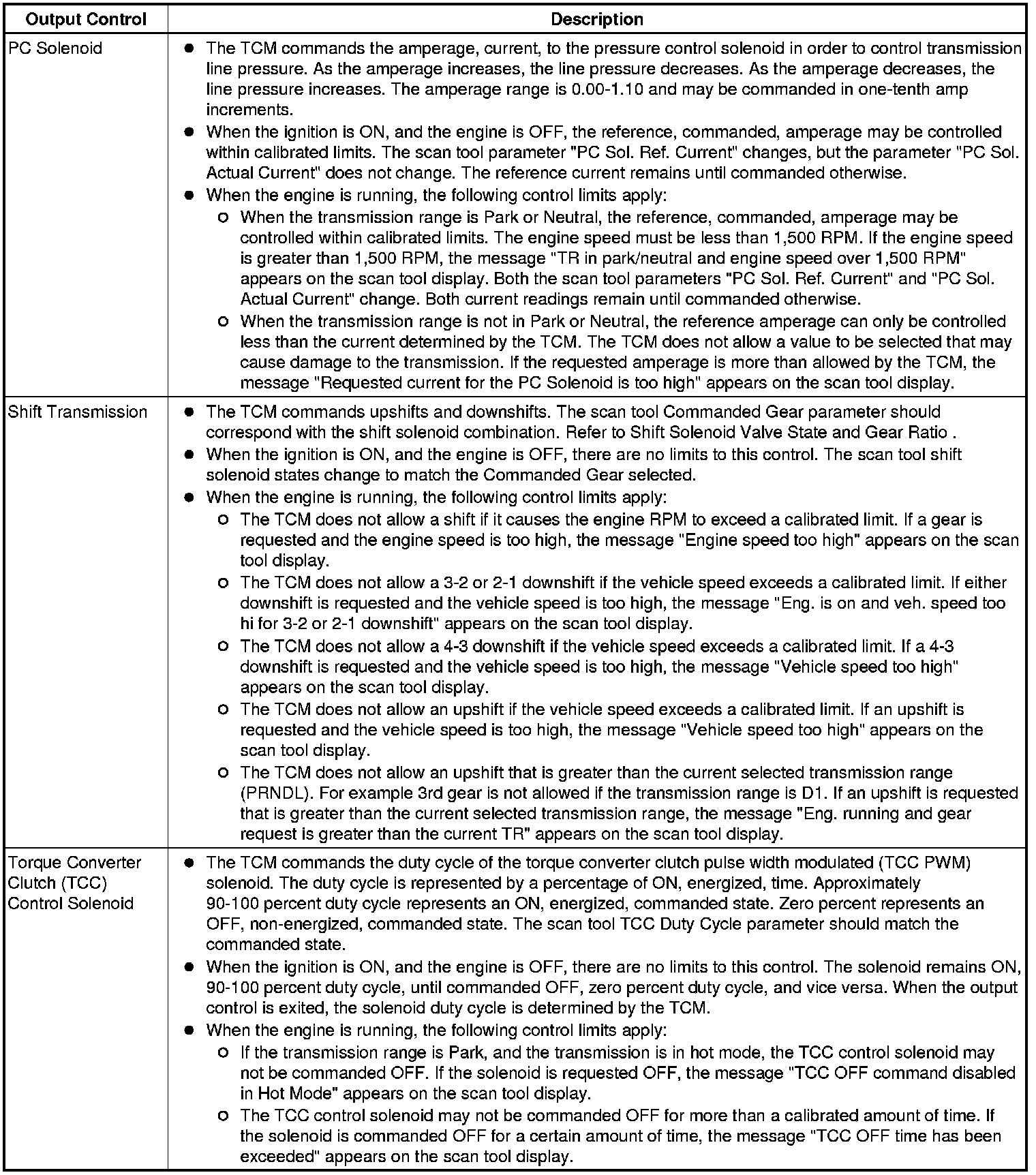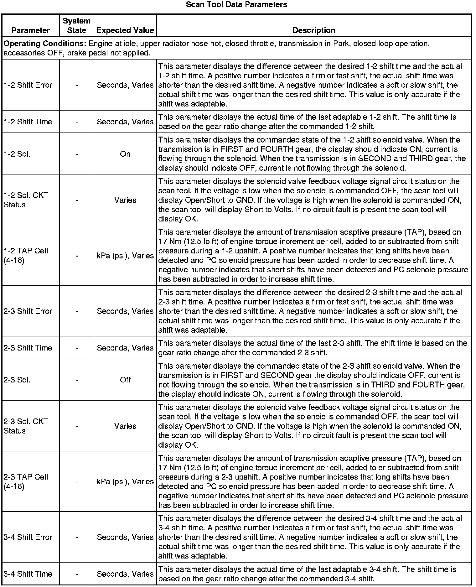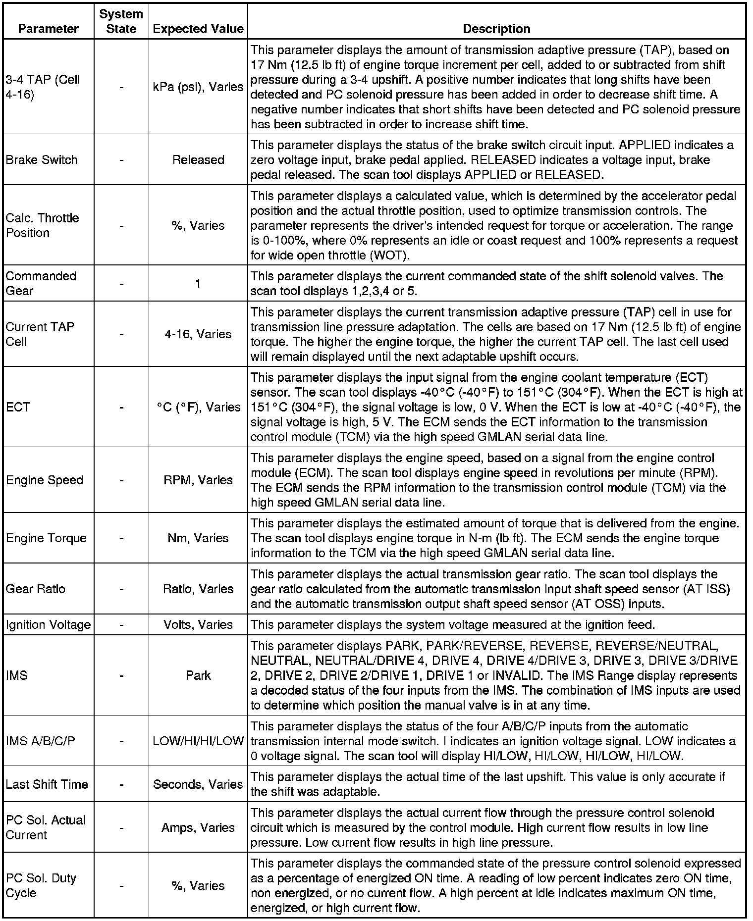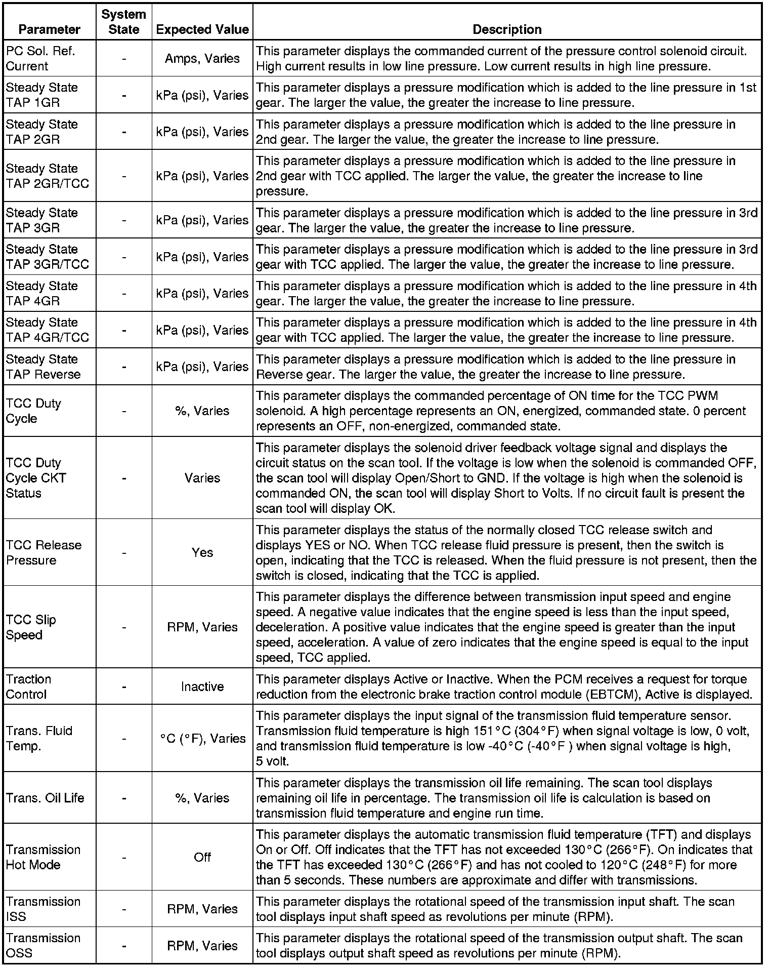 The Transmission Control Module Scan Tool Data List contains all transmission related parameters that are available on the scan tool. The list is arranged in alphabetical order. A given parameter may appear in any one of the data lists, and in some cases may appear more than once, or in more than one data list in order to group certain related parameters together.