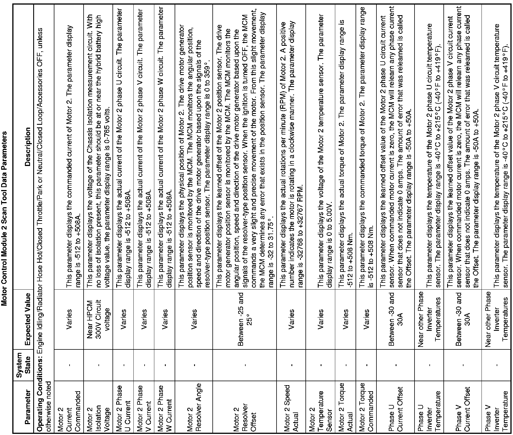 The scan tool values from a properly running vehicle may be used for comparison with the vehicle you are diagnosing. The Motor Control Module 2 Scan Tool Data Parameters list represents values that would be seen on a normally running vehicle.