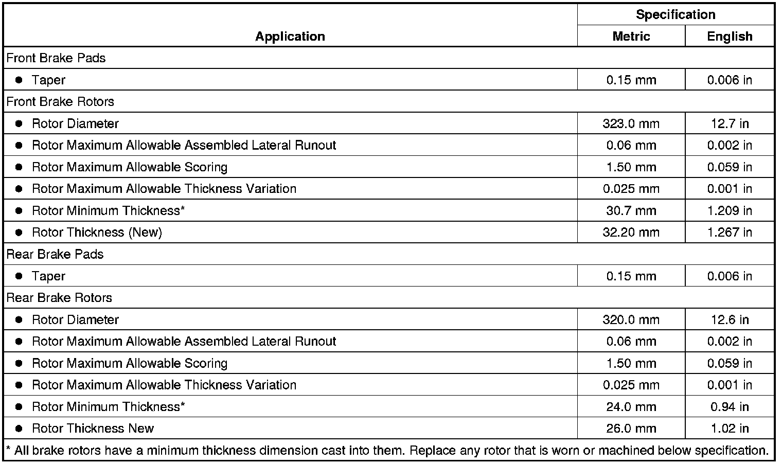Disc Brake Component Specifications