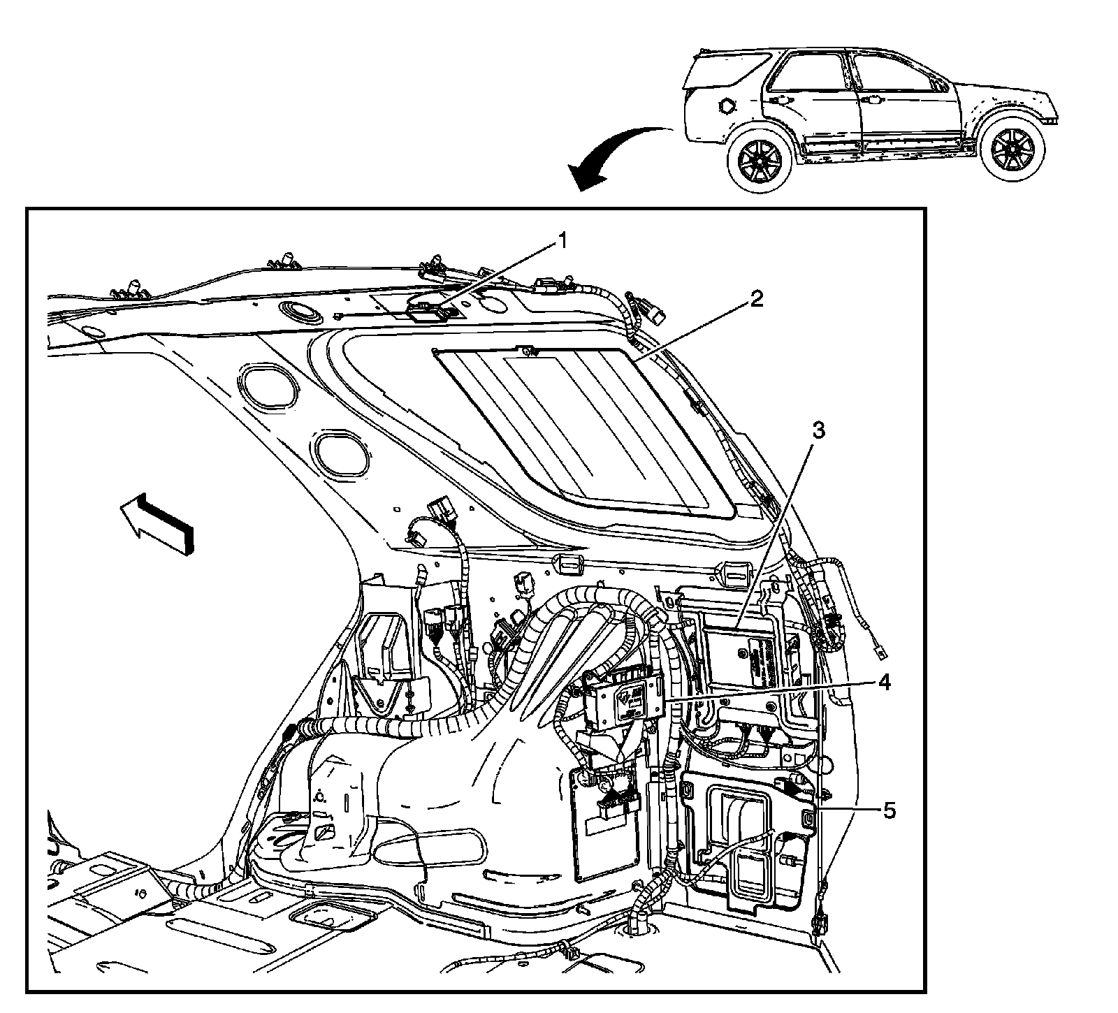 Home >> Cadillac >> 2009 >> SRX AWD V8-4.6L >> Repair and Diagnosis >> Powertrain Management >> Computers and Control Systems >> Relays and Modules - Computers and Control Systems >> Body Control Module >> Locations >> Luggage Compartment/Rear of Vehicle Component Views