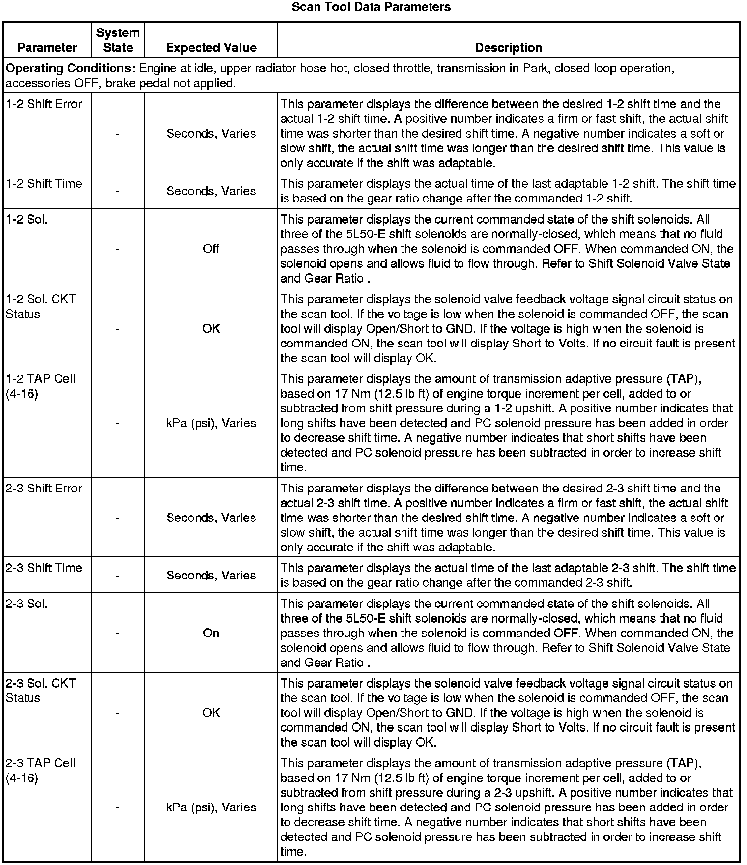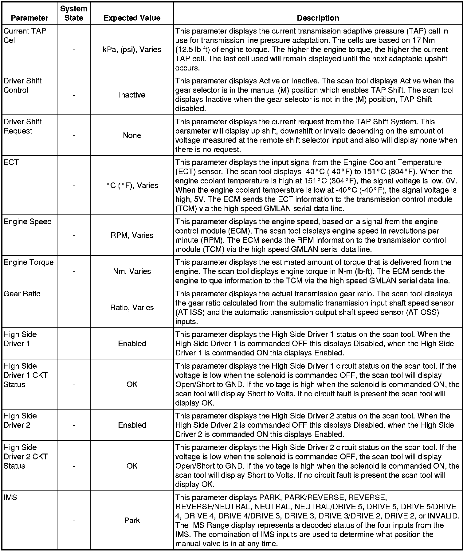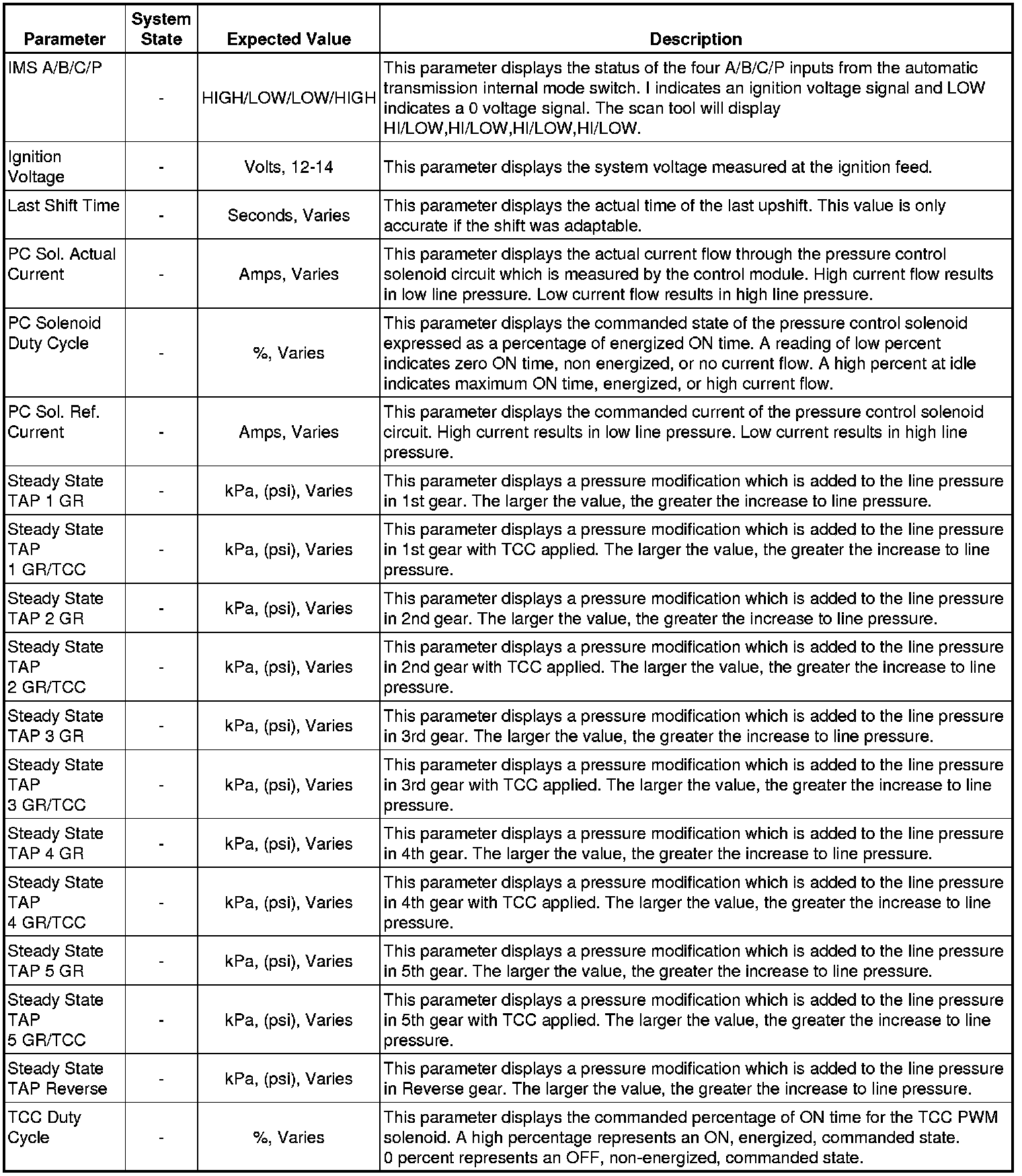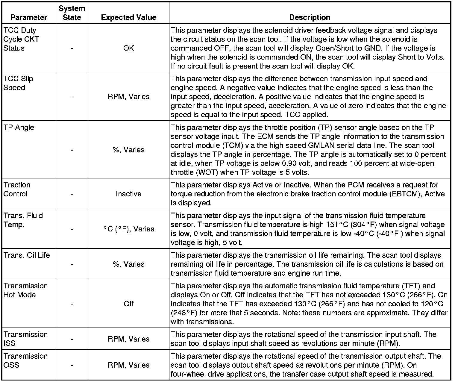 The Transmission Control Module Scan Tool Data List contains all transmission related parameters that are available on the scan tool. The list is arranged in alphabetical order. A given parameter may appear in any one of the data lists, and in some cases may appear more than once, or in more than one data list in order to group certain related parameters together.