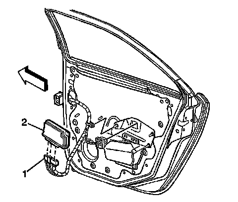 2. Remove the door control module (1) by releasing the retainer tabs (2).