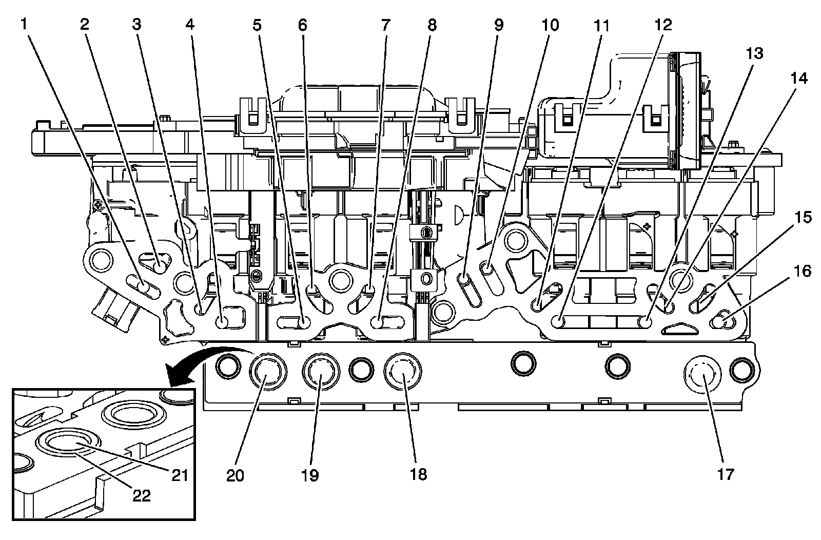 2. Inspect the four transmission fluid pressure (TFP) switches (17-20) for trapped debris or sediment. Any sediment or debris found under a switch membrane requires the control solenoid (w/body and TCM) valve assembly to be replaced. Check all TFP switch membranes (21) for cracks, cuts or pin holes. Ensure all TFP switch gaskets (22) are secure and are not deformed, torn, or improperly seated. As necessary, thoroughly rinse debris and sediment from the top of the switches. It is not necessary to remove the clutch plate soot from the entire surface of the control solenoid (w/body and TCM) valve assembly housing.