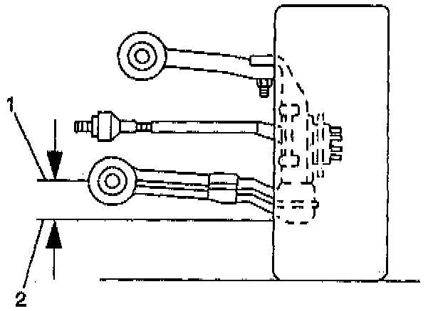 5. Measure the distance between the lowest point of the ball joint (2) and the center of the front side of the lower control arm mounting bolt (1), using the J 42854 .
