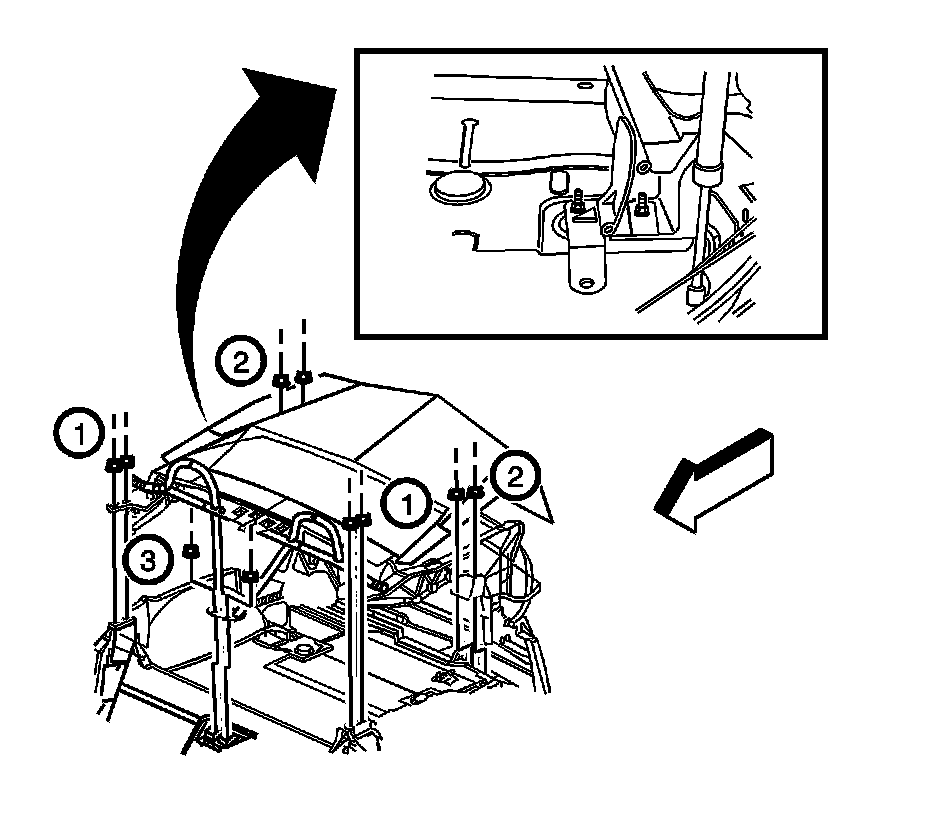 20. Remove the nuts (3) from the center roof support bracket.