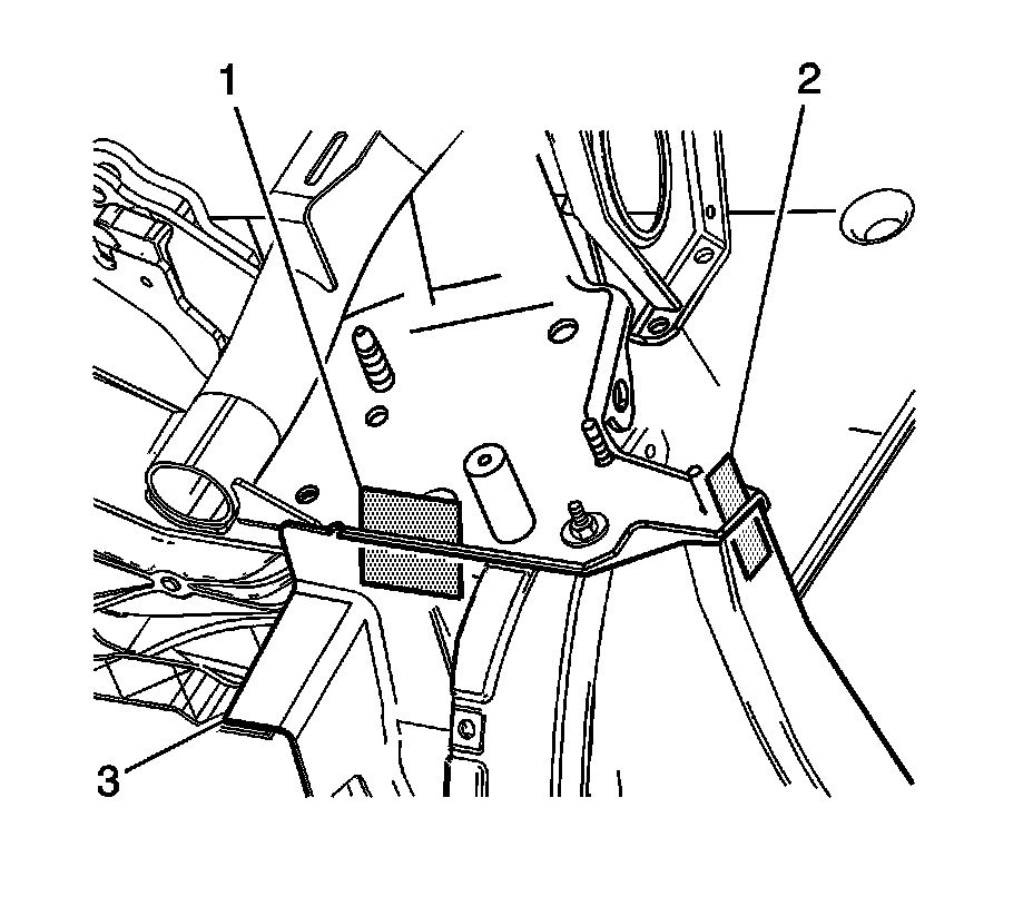 35. Apply a consistent bead of structural adhesive to the bonding mating surfaces on the backing plates (1,2) and on the vehicle (3). Refer to Sheet Molded Compound (SMC) Panel Bonding ().