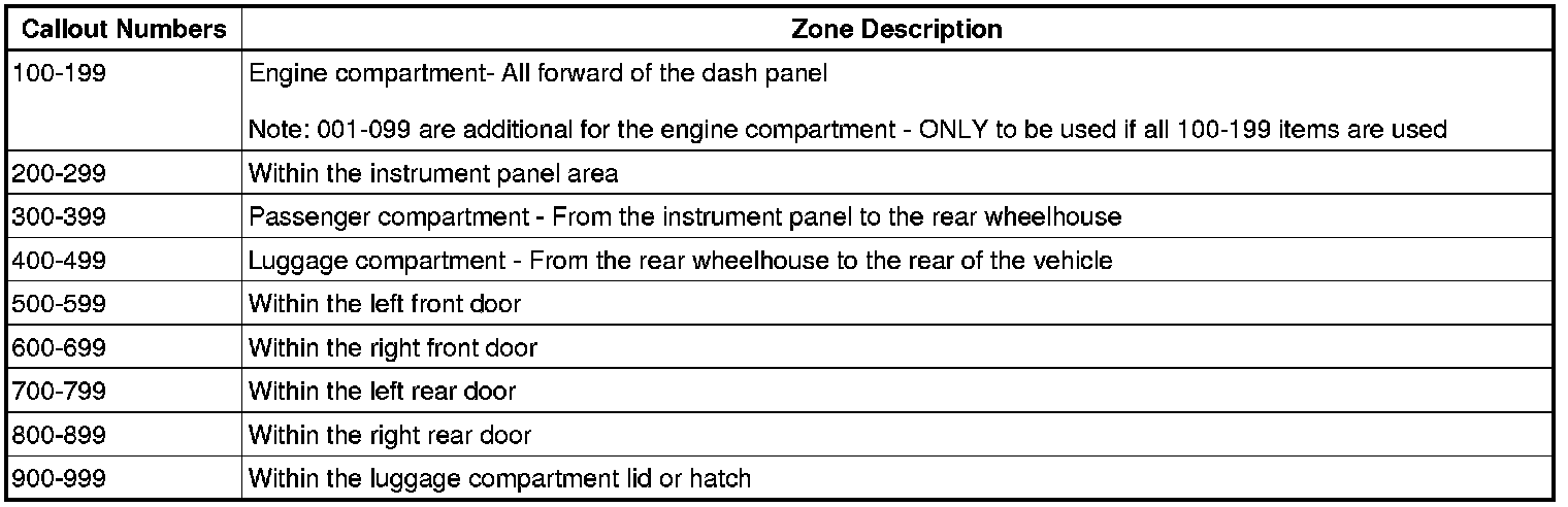 All grounds, in-line connectors, pass-through grommets, and splices have identifying numbers that correspond to where they are located in the vehicle. The following table explains the numbering system.
