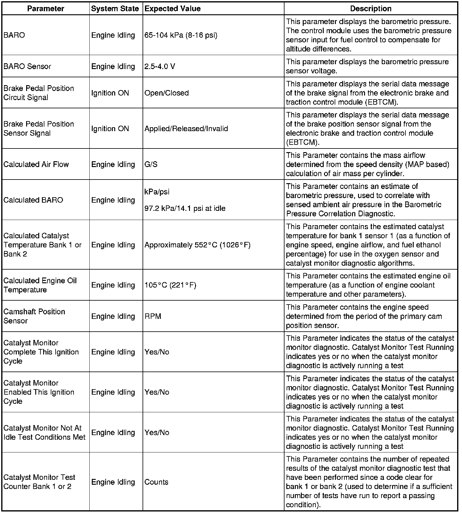 Only the parameters listed below are referenced in this service manual for use in diagnosis.