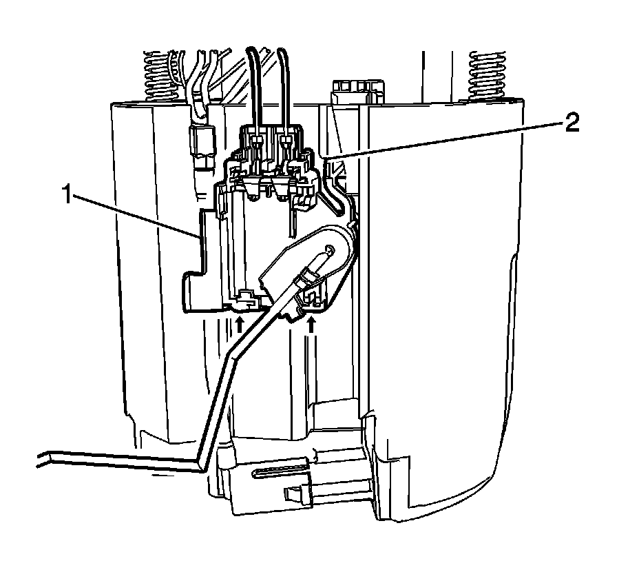 2. Slide the fuel level sensor (1) downward until the locking tab (2) locks into place.