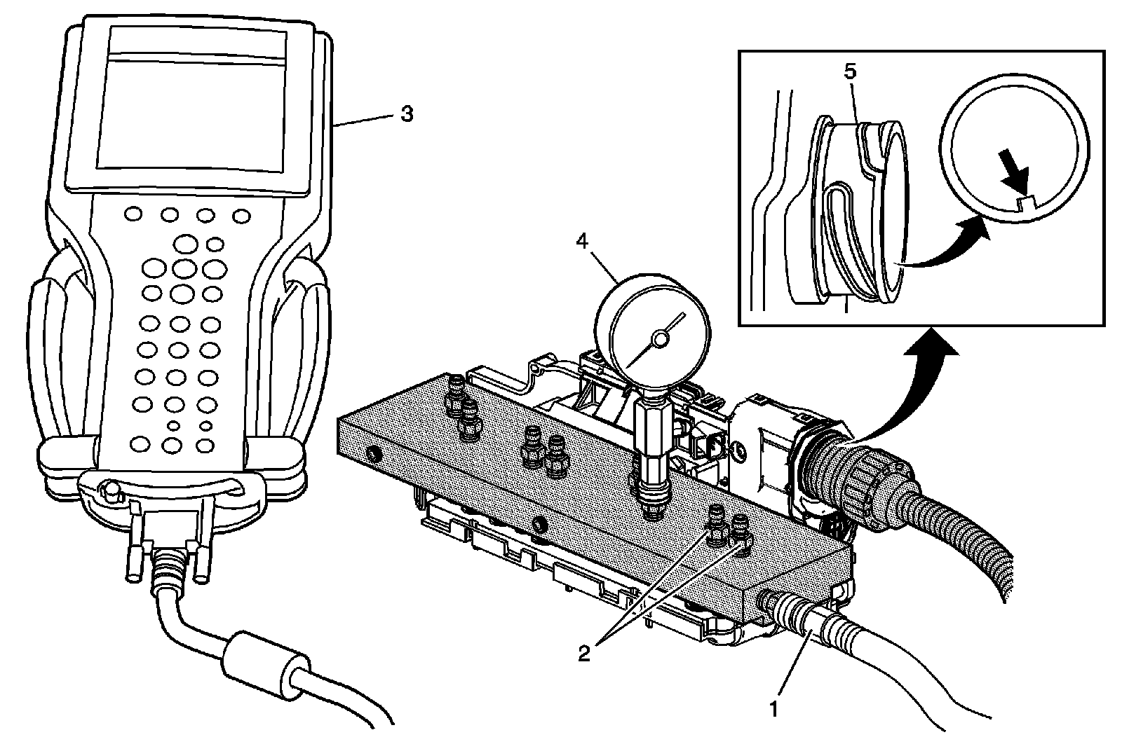 A pressure gauge is used to measure the pressurized air through the solenoid control ports. When a solenoid is commanded ON with the scan tool, pressurized air flows through the solenoid control port and displays on the pressure gauge. When the solenoid is commanded OFF with the scan tool, there is no pressurized air flow through the solenoid control port to the pressure gauge. The recommended shop air pressure for this test is 620.5-690.4 Kpa (90-100 psi).